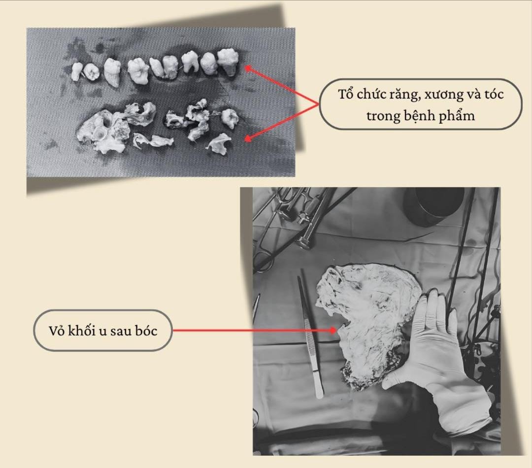 Bằng thao tác tỉ mỉ, khéo léo, các bác sĩ đã bóc tách thành công khối u, giữ lại tối đa mô buồng trứng lành để bảo tồn khả năng sinh sản cho bệnh nhân. Bệnh phẩm thu được hơn chục mảnh xương và răng, kèm tóc.