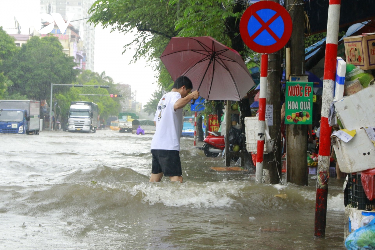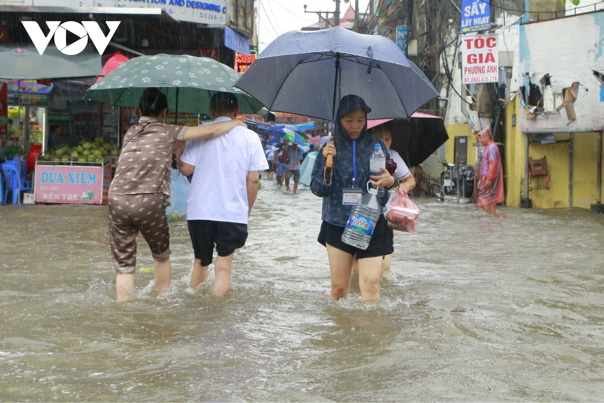 Trời tiếp tục mưa như trút, chị Huyền ôm chặt đống đồ lỉnh kỉnh trong tay, từng bước chật vật băng qua con đường ngập nước.