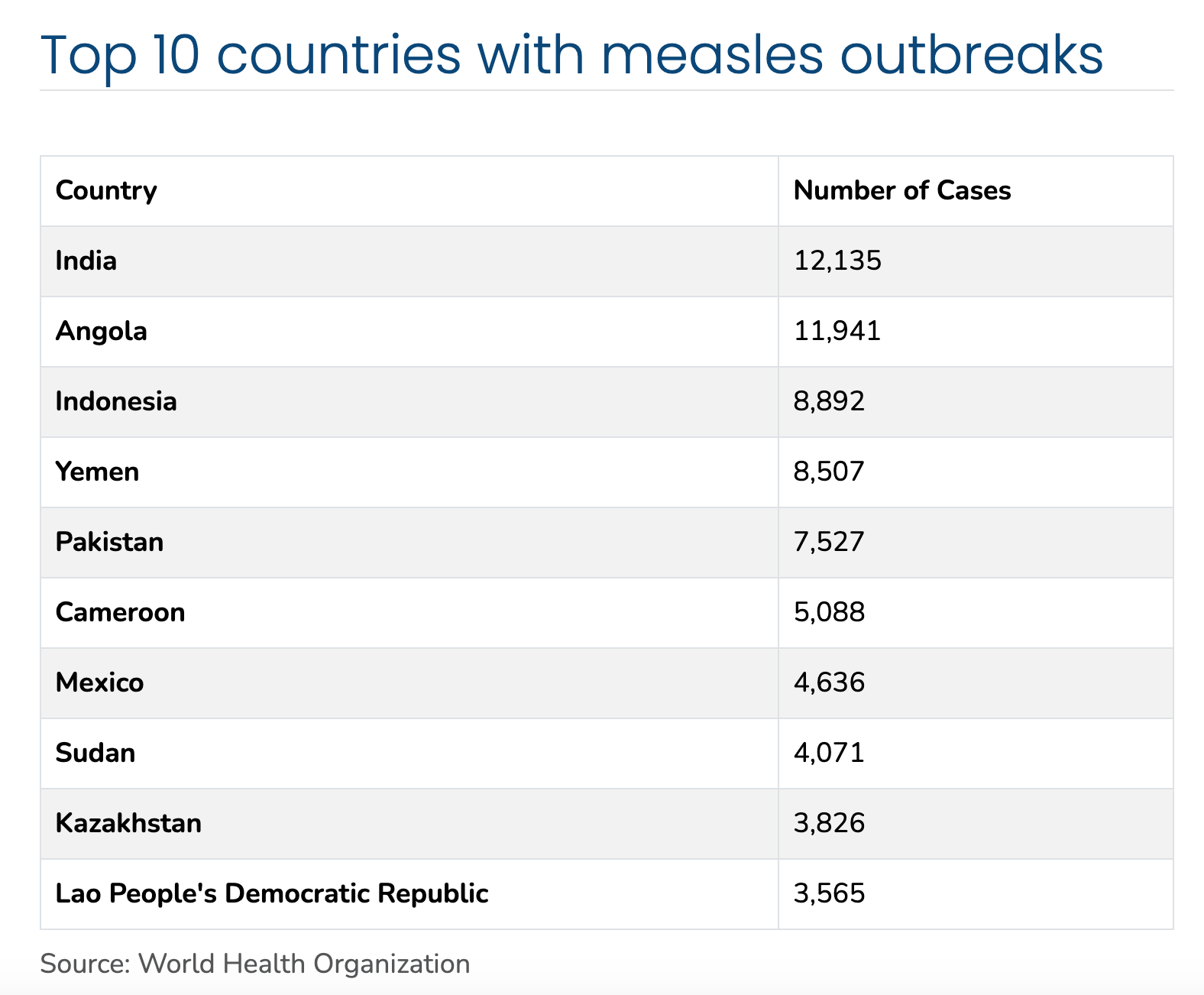 Báo cáo của Tổ chức Y tế Thế giới thống kê 10 quốc gia ghi nhận nhiều ca mắc bệnh sởi nhất, tính đến tháng 2 năm 2026. Nguồn: WHO