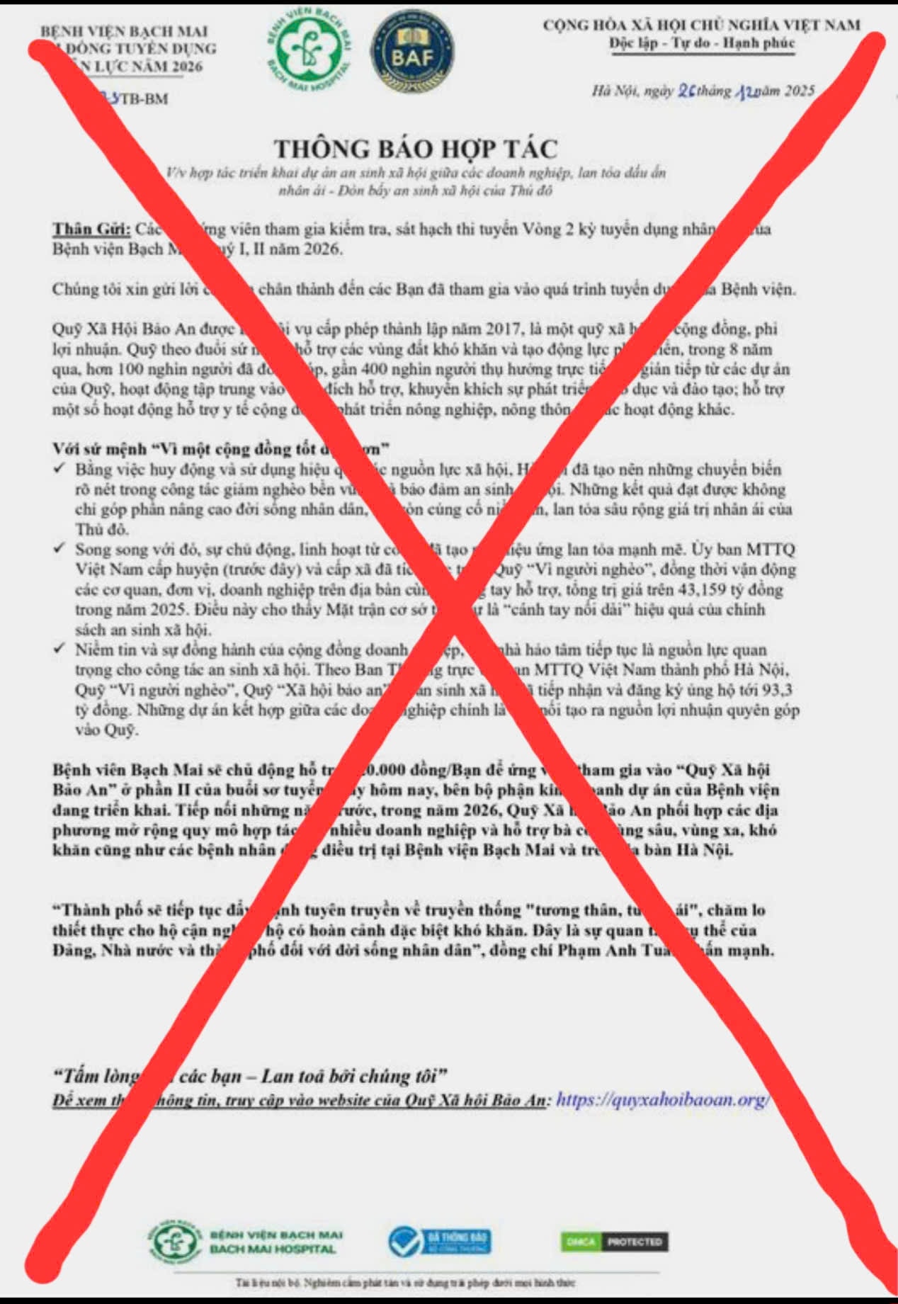 Bệnh viện Bạch Mai khẳng định, mọi thông báo liên quan đến tuyển dụng, hợp tác, tài trợ hoặc hỗ trợ ứng viên đều được thực hiện qua kênh chính thức. Bệnh viện không yêu cầu ứng viên cung cấp thông tin tài khoản, CCCD qua tin nhắn cá nhân và không thực hiện việc chuyển tiền hỗ trợ theo hình thức này.