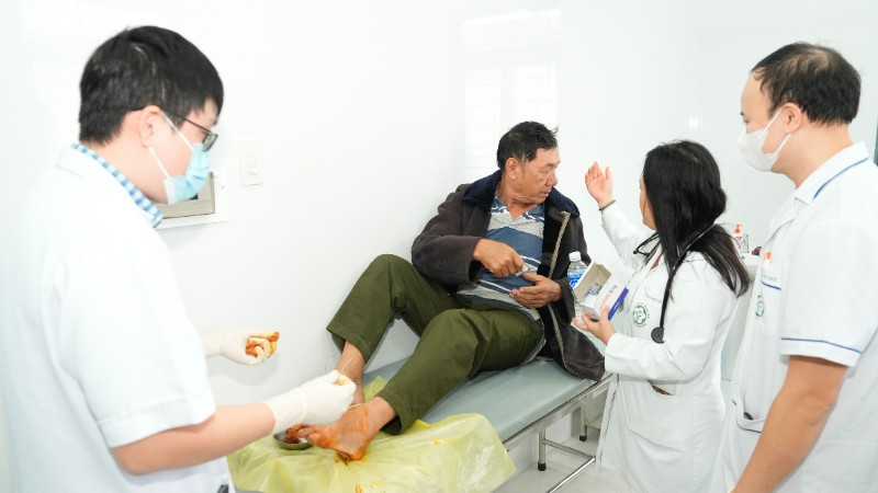 Các bác sĩ trong đoàn công tác trực tiếp xử trí một ca cấp cứu chấn thương bàn chân cho người.