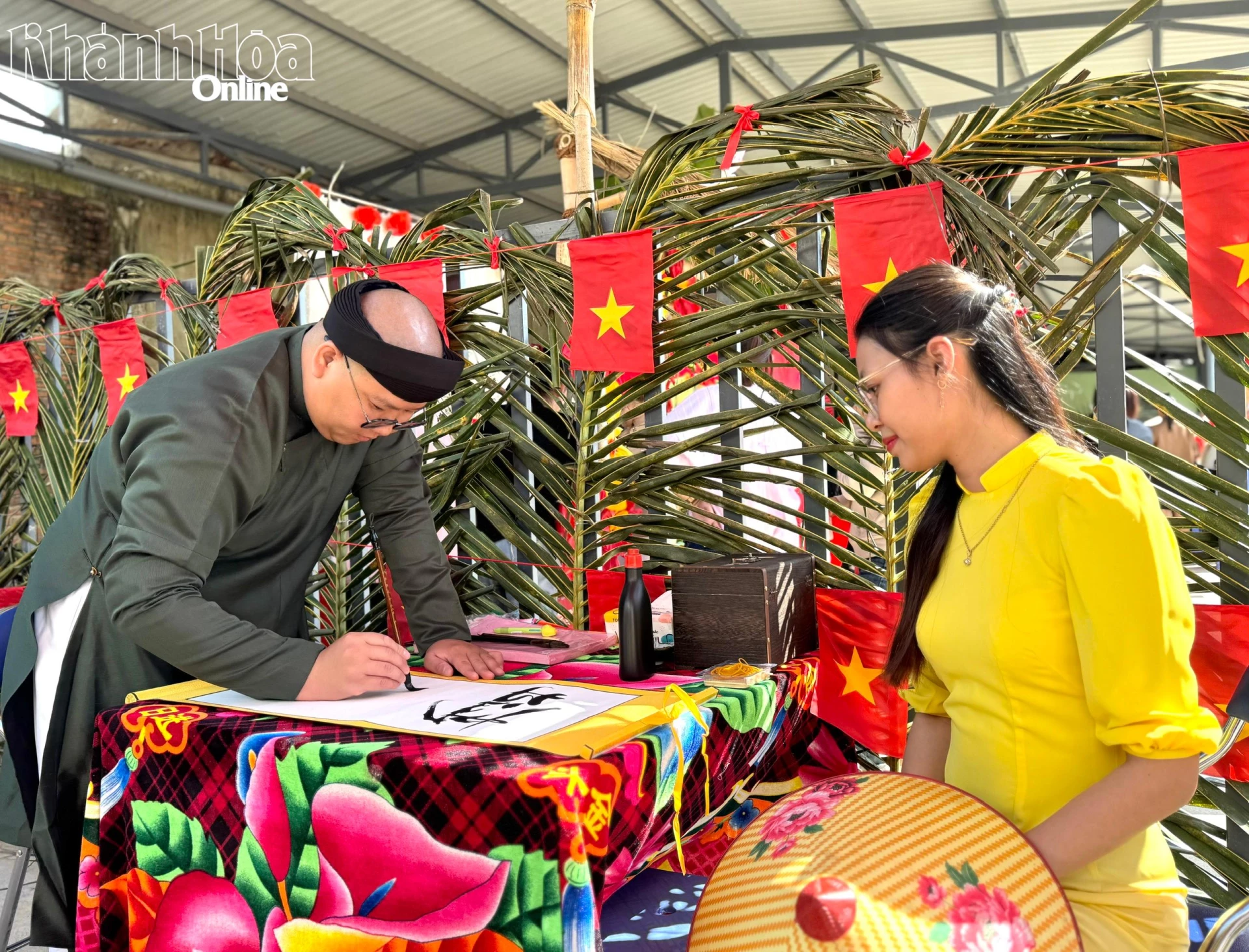 Viết câu đối thư pháp tặng khách hàng.