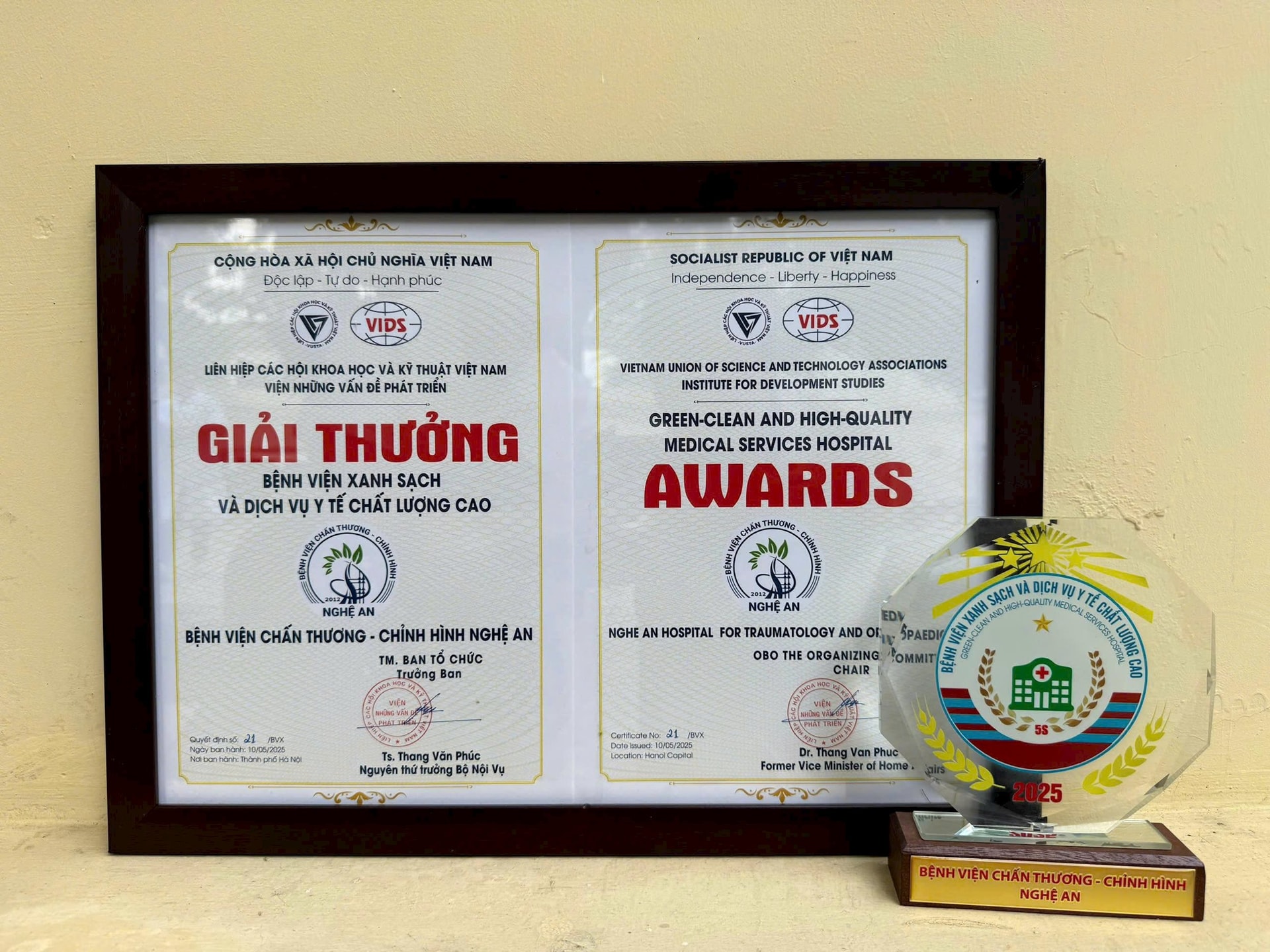 Bệnh viện được Liên Hiệp các Hội Khoa học và Kỹ thuật Việt Nam trao tặng Giải thưởng Bệnh viện xanh sạch và dịch vụ y tế chất lượng cao.