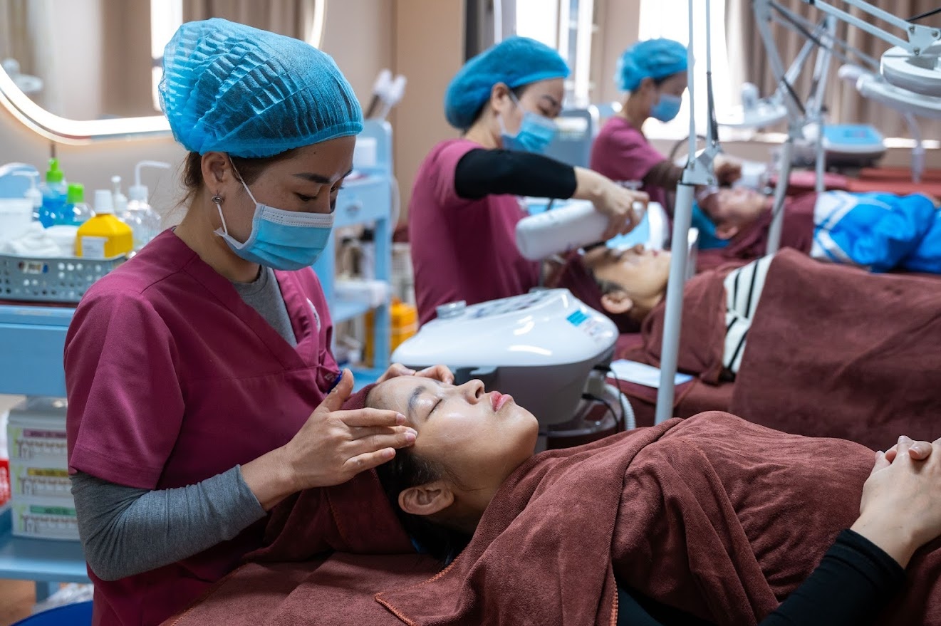Bác sĩ tư vấn cho Hà một liệu trình chăm sóc da chuyên sâu, quy trình được thực hiện từng bước rõ ràng: làm sạch da, loại bỏ tế bào chết, đắp mặt nạ làm mát, kết hợp điện chuyển ion và siêu âm để đưa dưỡng chất thấm sâu. Cuối cùng, cô được bôi kem dưỡng và chống nắng, giúp làn da dần tươi sáng, khỏe khoắn hơn.
