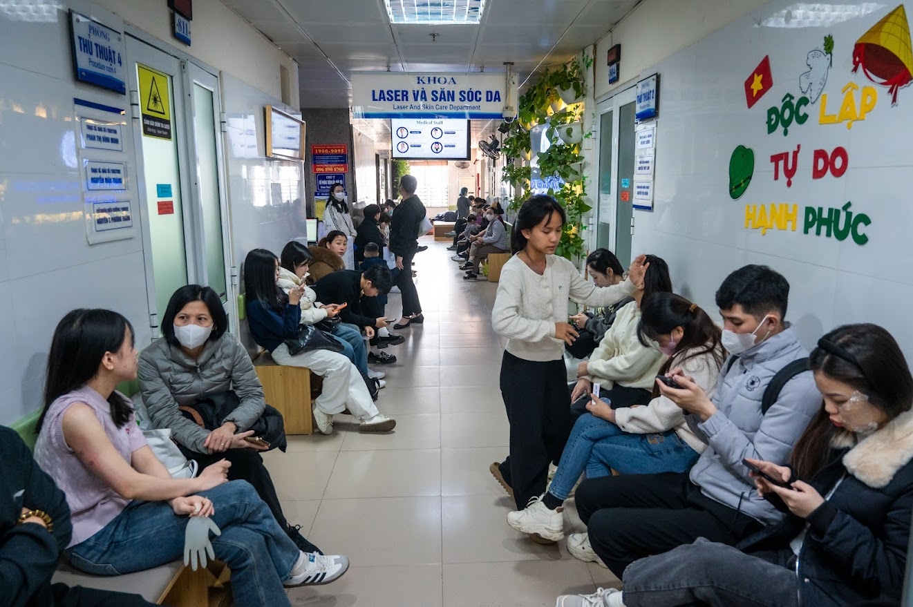 Những ngày giáp Tết, khoa Laser và Săn sóc da, khoa Nghiên cứu và ứng dụng công nghệ Tế bào gốc, Bệnh viện Da liễu Trung ương, luôn trong tình trạng quá tải. Hành lang chờ khám kín người từ sáng sớm, phần lớn là các trường hợp đến điều trị da, làm đẹp để "kịp Tết".