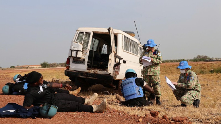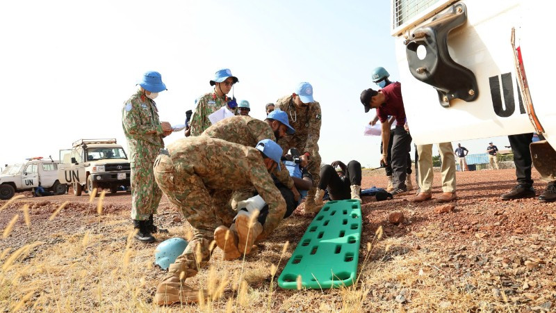Tình huống giả định mô phỏng một đoàn tuần tra của Lực lượng cảnh sát gìn giữ hòa bình Liên hợp quốc di chuyển qua tuyến Guit Road (nối từ căn cứ Liên hợp quốc tại Bentui tới khu Trại tị nạn) thì gặp vật nổ, làm 10 thành viên bị thương với mức độ nặng, nhẹ khác nhau. Sau báo cáo ban đầu, Trung tâm Điều hành khủng hoảng (FIOC) phối hợp với Cơ quan An ninh và An toàn Liên hợp quốc (UNDSS), Cơ quan hành động bom mìn Liên hợp quốc (UNMAS) và cơ quan y tế phân khu kích hoạt cơ chế chỉ huy MCI và huy động lực lượng y tế toàn phân khu tham gia hỗ trợ cấp cứu, vận chuyển nạn nhân.
