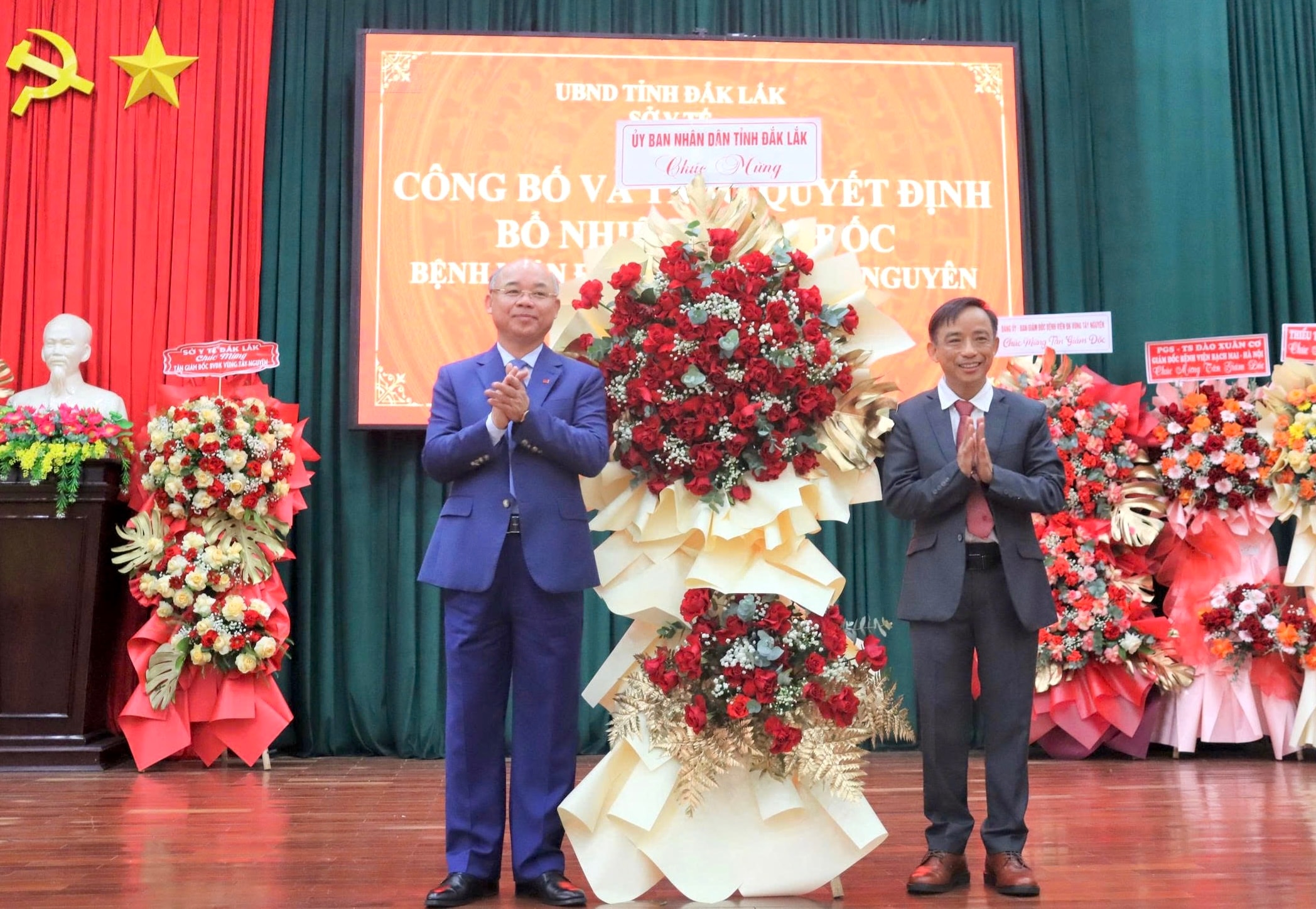 Phó Chủ tịch UBND tỉnh Đắk Lắk Trương Công Thái chúc mừng tân Giám đốc Bệnh viện Đa khoa vùng Tây Nguyên BS.CKII Trịnh Hồng Nhựt