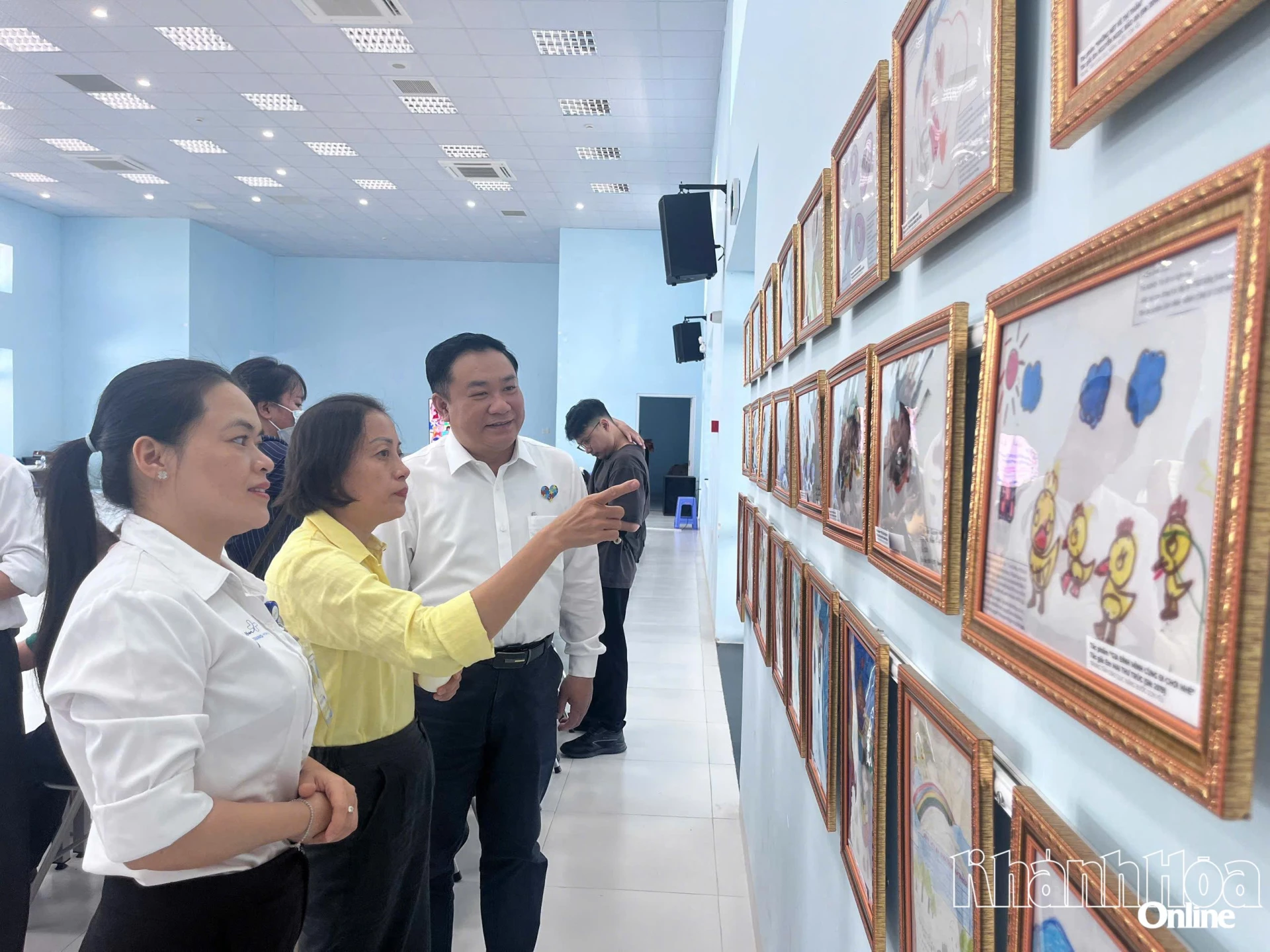 Các đại biểu tham quan khu trưng bày tranh do các trẻ rối loạn phát triển thần kinh vẽ.