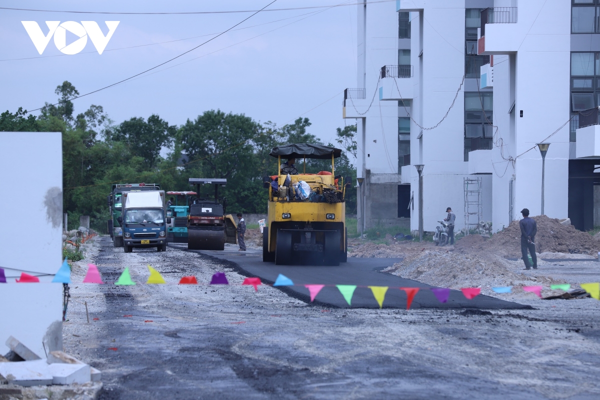Công nhân cùng các loại máy móc thi công đang khẩn trương hoàn thiện đường nội bộ, đảm bảo hạ tầng đồng bộ trong khuôn viên Bệnh viện Việt Đức cơ sở 2.