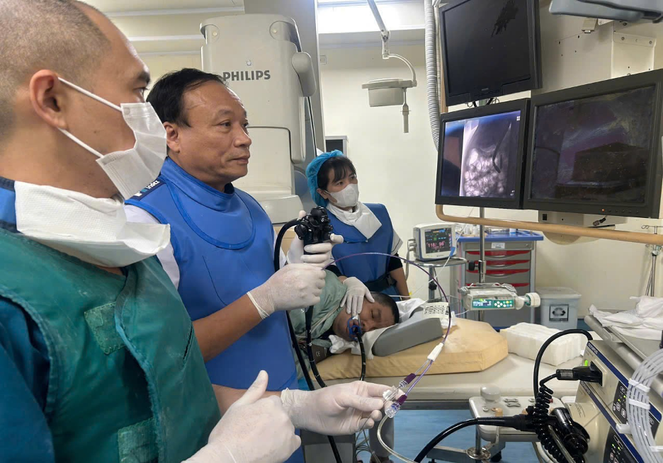 Sau khi hội chẩn, các Bác sĩ Khoa Nội Tiêu hóa đã chỉ định nội soi mật tụy ngược dòng (ERCP) dưới hướng dẫn của hệ thống chụp mạch số hóa xóa nền (DSA) đồng thời các bác sỹ trong khoa gấp xử lý các tình huống cần thiết cho bệnh nhân.