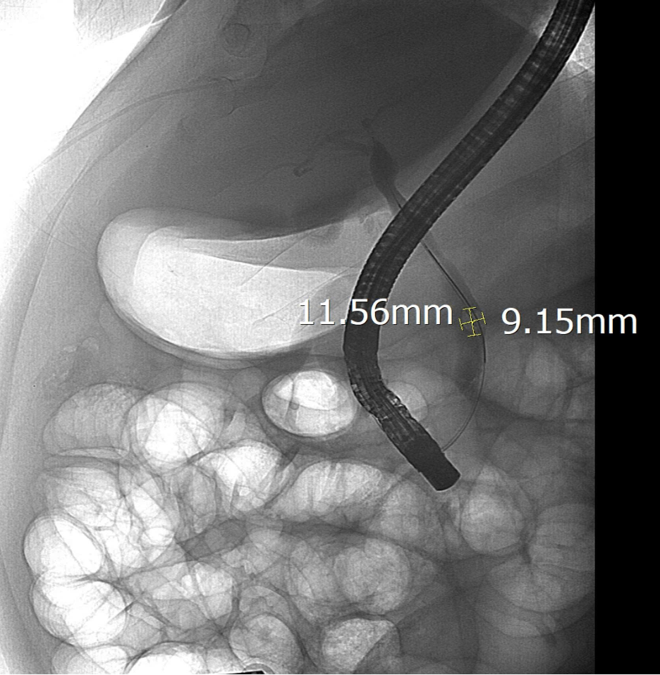 Trong quá trình can thiệp, ê-kíp đã lấy thành công viên sỏi kích thước 11,5 x 9 mm, giải phóng tình trạng sỏi ống mật chủ cứu sống bệnh nhân kịp thời.