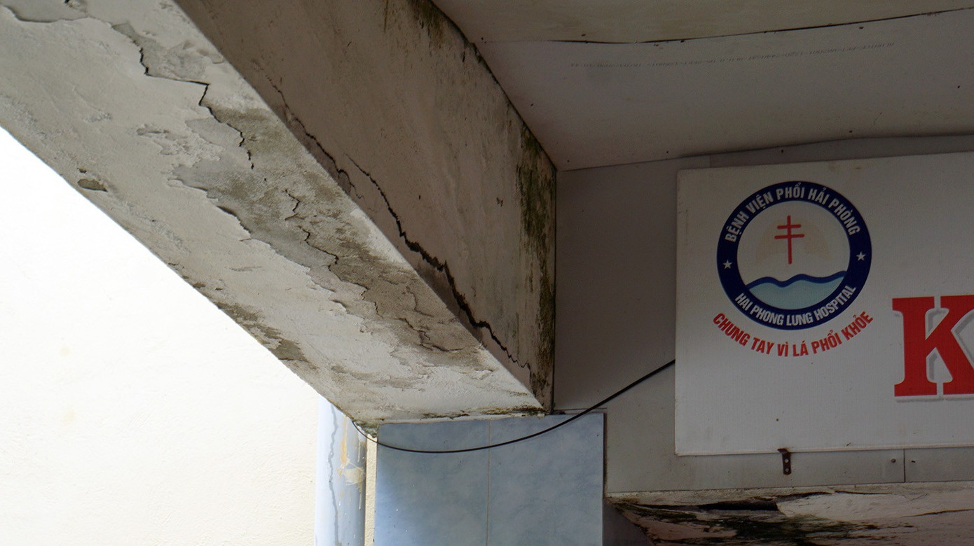 Nhiều tòa nhà tại Bệnh viện phổi Hải Phòng xuống cấp, tường bong tróc, thấm dột được vá nhưng tình trạng xuống cấp không được cải thiện.