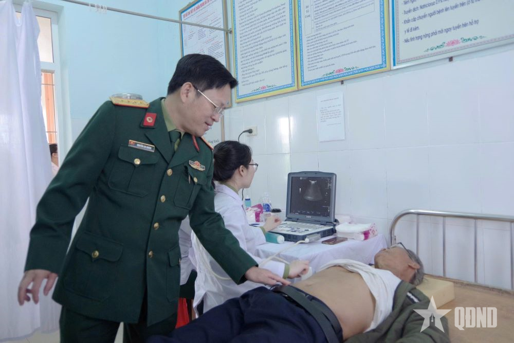 Đại tá, Bác sĩ chuyên khoa II, Thầy thuốc Ưu tú Nguyễn An Giang, Bí thư Đảng ủy, Giám đốc Bệnh viện Quân y 4 thăm khám cho nhân dân.