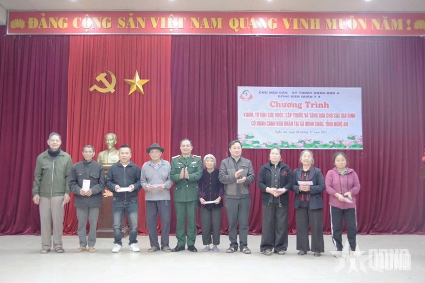 Cũng trong buổi sáng ngày, đoàn công tác đã trao 20 suất quà trị giá với tổng giá trị 10 triệu đồng tặng các gia đình có hoàn cảnh khó khăn thuộc xã Minh Châu, tỉnh Nghệ An. Đợt khám chữa bệnh của Bệnh viện Quân y 4 lần này không chỉ chăm sóc sức khỏe ban đầu, hỗ trợ vật chất và tinh thần cho người dân mà còn thể hiện tình cảm quân dân gắn bó máu thịt, nhất là đối với các gia đình có hoàn cảnh khó khăn.