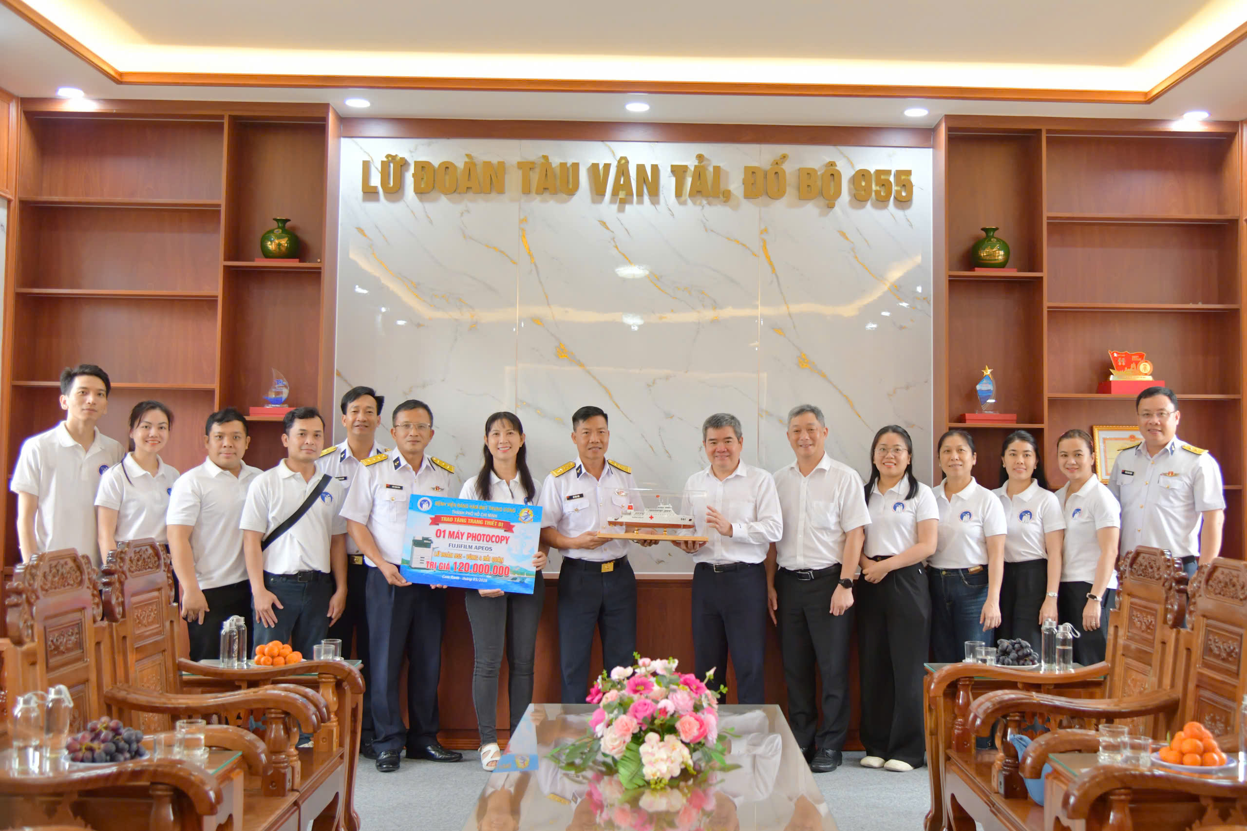 TS. BSCKII Lê Trung Chánh, Giám đốc Bệnh viện Răng Hàm Mặt Trung ương TP Hồ Chí Minh trao tặng máy photocopy trị giá 120 triệu đồng cho đại diện Lữ đoàn.