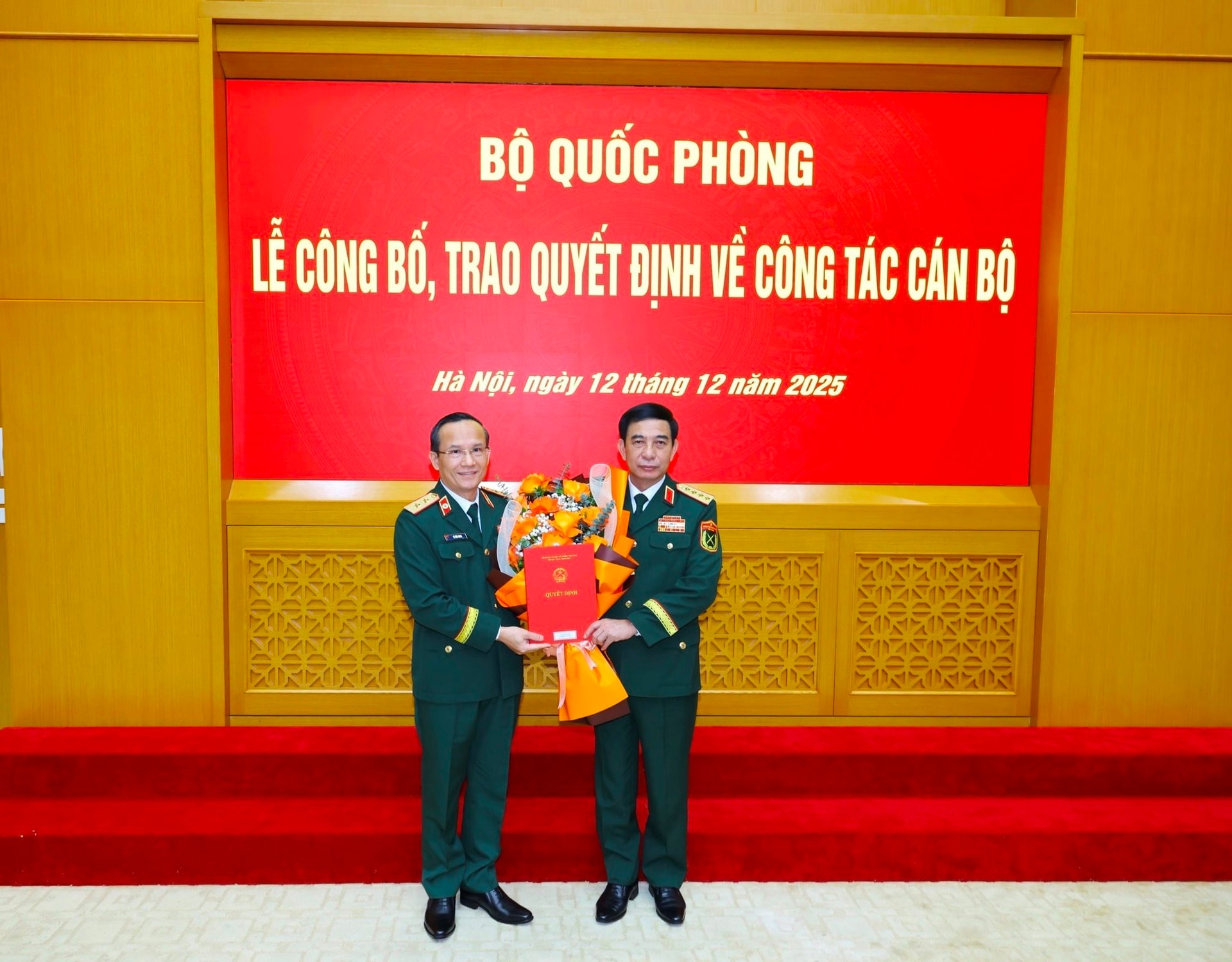 Đại tướng Phan Văn Giang – Ủy viên Bộ Chính trị, Phó Bí thư Quân ủy Trung ương, Bộ trưởng Bộ Quốc phòng trao Quyết định thăng quân hàm từ Thiếu tướng lên Trung tướng cho GS, TS Lê Hữu Song - Giám đốc Bệnh viện Trung ương Quân đội 108