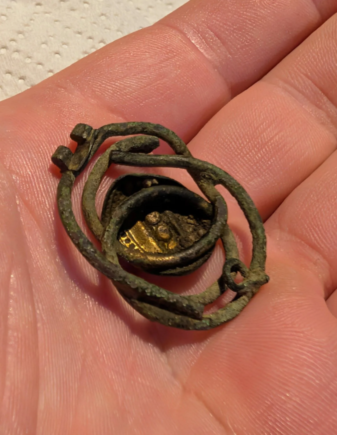 Hợp kim—có lẽ là đồng thau hoặc đồng đỏ—cho thấy dấu vết của quá trình oxy hóa màu xanh lục và bên trong có dấu vết rõ ràng của lớp mạ vàng, hiện đã bị mòn nhưng vẫn có thể nhìn thấy ở những vị trí nhất định. Ảnh: @Jay Sangster-Hawkins.