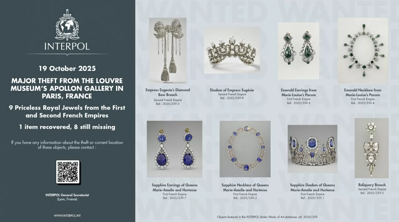 Tấm áp phích do Interpol thiết kế về các cổ vật bị đánh cắp ở Bảo tàng Louvre hôm 19/10. (Nguồn: Interpol)