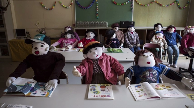 Bà Ayano đã sắp xếp hơn 40 con búp bê được làm thủ công trong khuôn viên của ngôi trường bị đóng cửa.