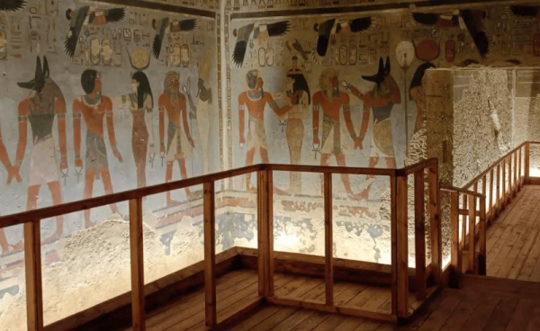 Tiếng bước chân của các khách tham quan vang lên nhẹ giữa lối hầm dài, nơi ánh sáng nhân tạo xuyên qua những bức tường mờ màu vàng nâu với nhiều hình khắc cổ xưa đã phai theo thời gian. Hương bụi sa mạc quện trong không khí khiến người ta có cảm giác như vừa xuyên qua lớp thời gian dày đặc để bước vào thế giới của hơn 3.300 năm trước. Tiếp đó, những mảnh tranh màu đỏ son, vàng nghệ, lam ngọc và đen huyền đã được phục hồi cũng đang kể câu chuyện về hành trình thần thánh của linh hồn nhà vua tiến vào cõi vĩnh hằng.