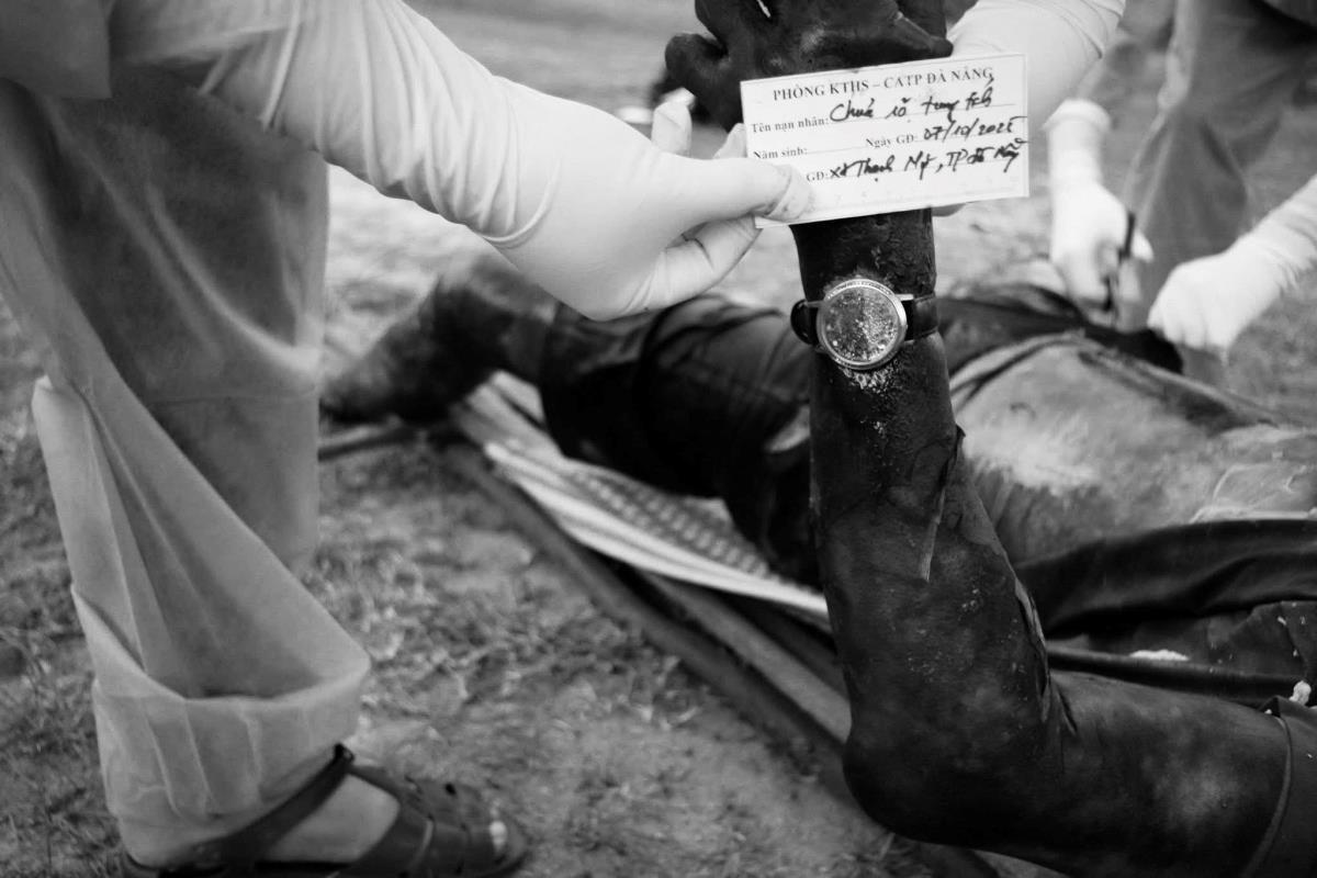 Cơ quan Cảnh sát điều tra (CSĐT) Công an TP Đà Nẵng phối hợp với Phòng Kỹ thuật hình sự Công an thành phố, Viện KSND thành phố tiến hành khám nghiệm hiện trường, khám nghiệm tử thi. Qua khám nghiệm cho thấy tử thi khoảng 35 tuổi, cao khoảng lm60, nặng khoảng 60kg, mặc quần đùi màu xanh đen, áo đỏ, tay trái đeo đồng hồ dây da màu đen. Thi thể đang trong giai đoạn phân hủy. Điều đáng nói, trên lưng tử thi có đeo 1 ba-lô màu đen, bên trong có một tảng đá nặng khoảng 20kg.
