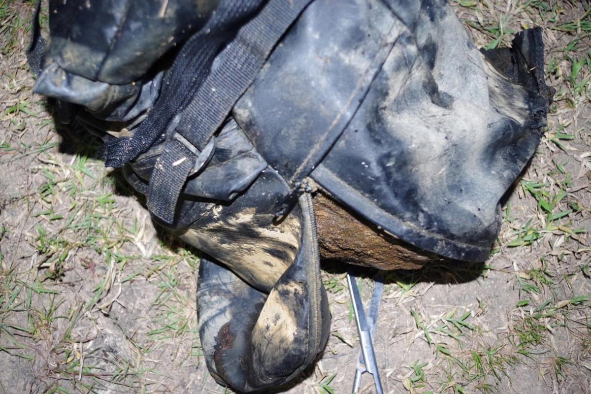 Tay trái tử thi có đeo đồng hồ dây da màu đen, trên người tử thi có ba-lô chứa tảng đá nặng 20kg.
