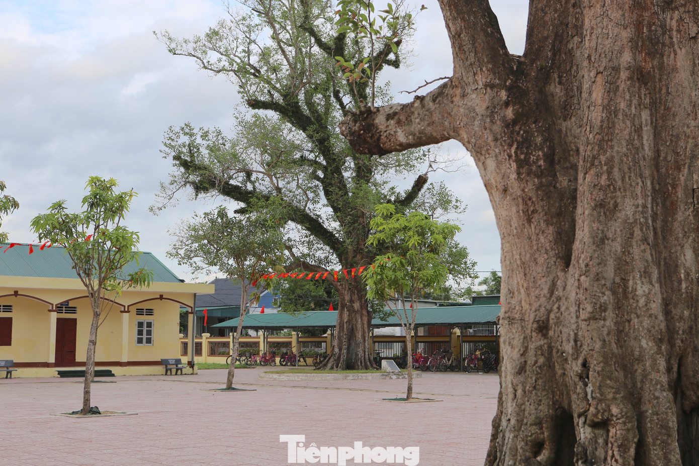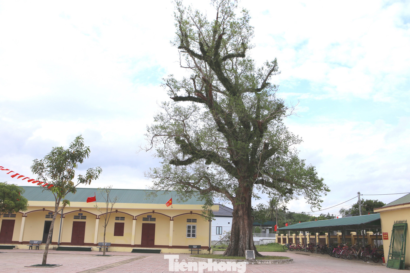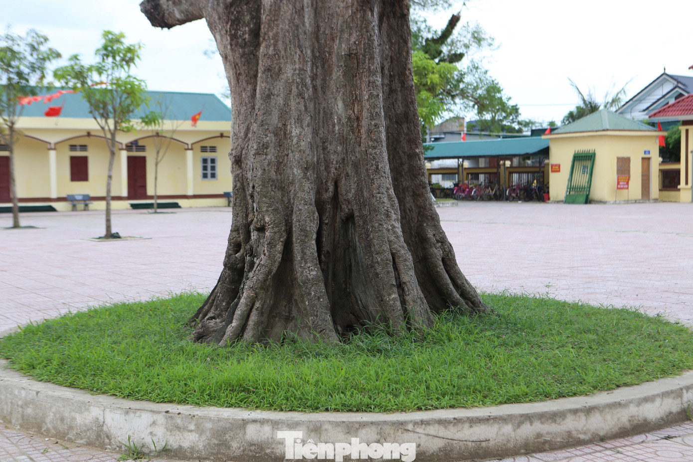 Thân cây xù xì, sần sùi theo dấu vết thời gian, từng đường nứt gãy như khắc lại tuổi đời hàng trăm năm. Tán lá vẫn xanh mướt, sum suê và vươn rộng, nhờ được người dân và nhà trường chăm sóc gìn giữ.
