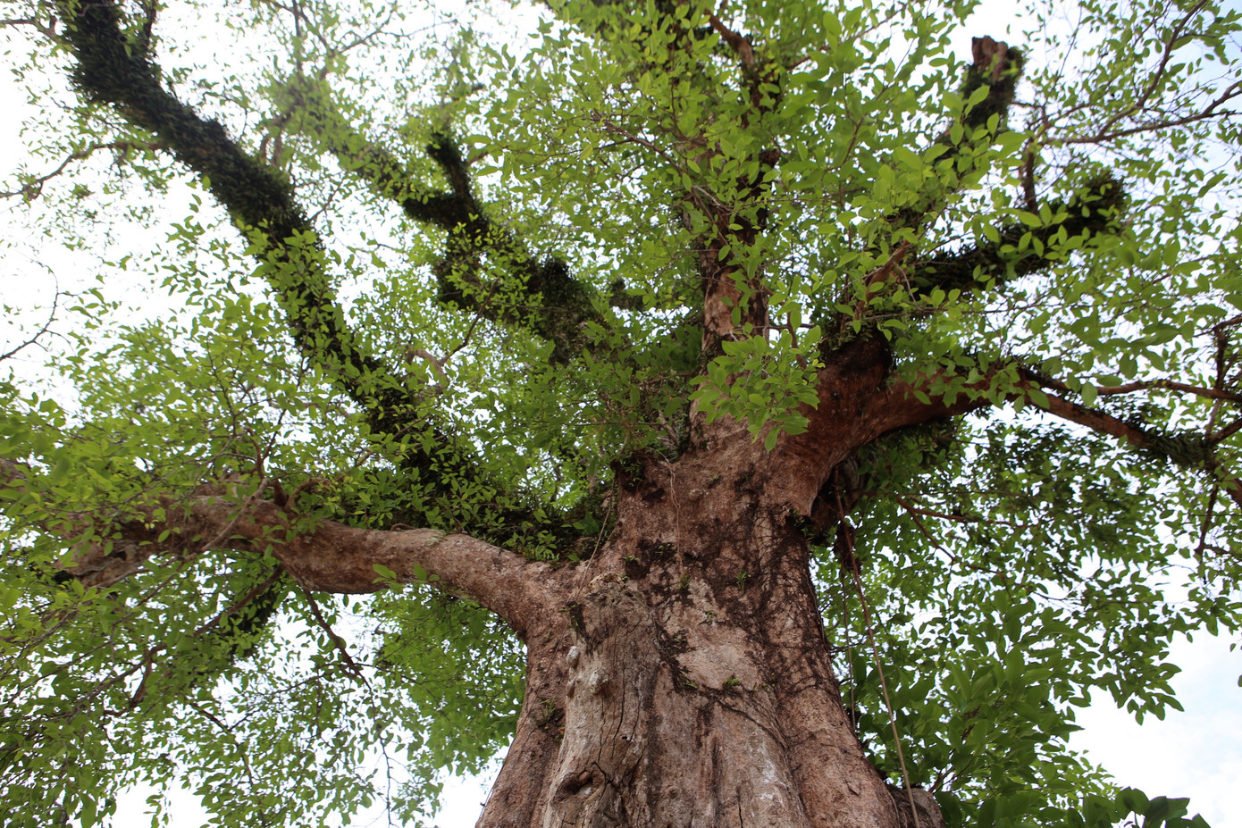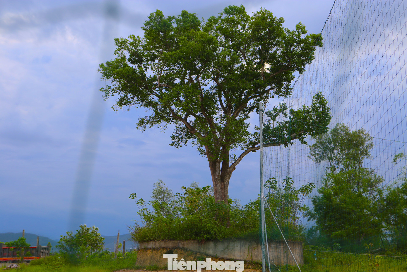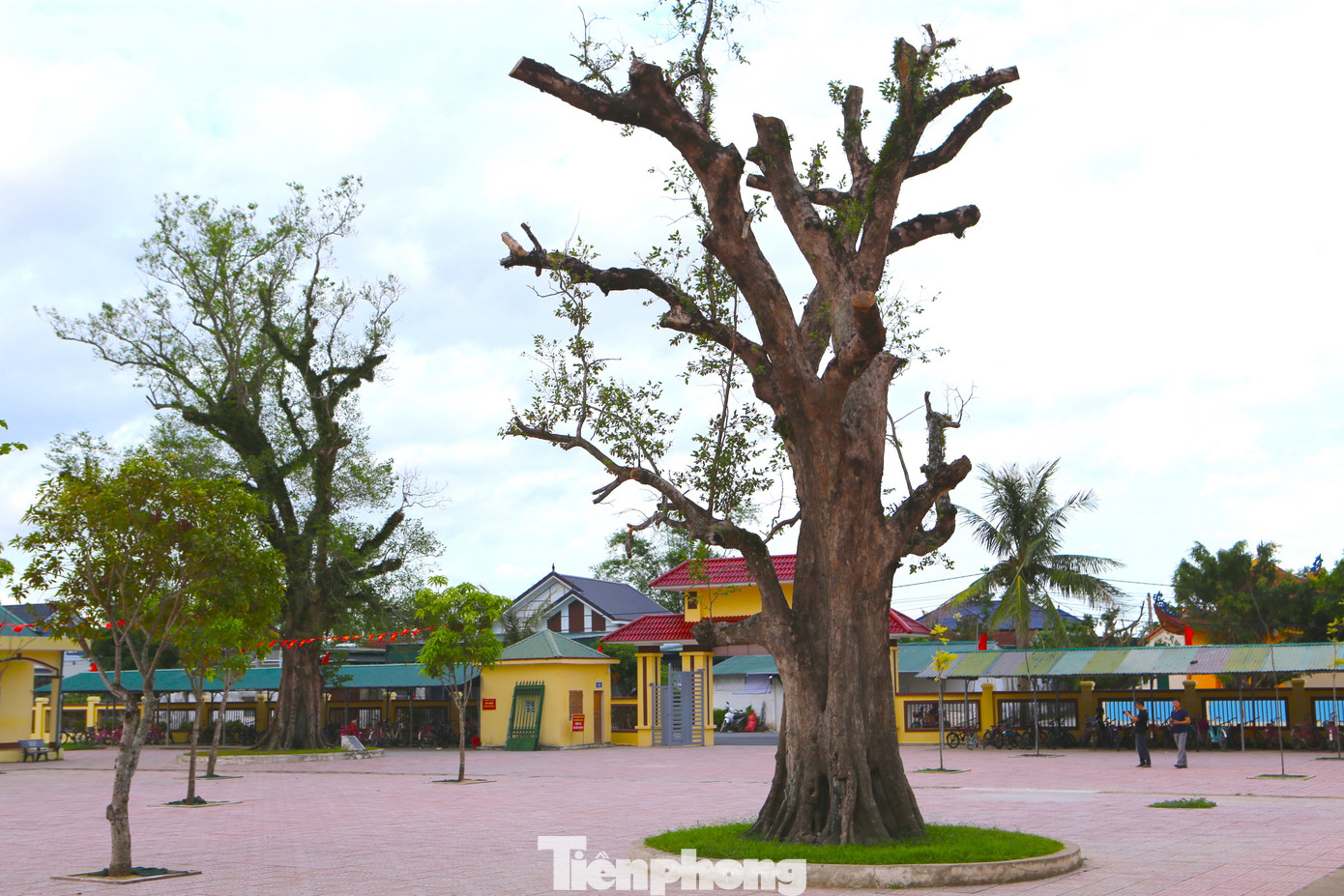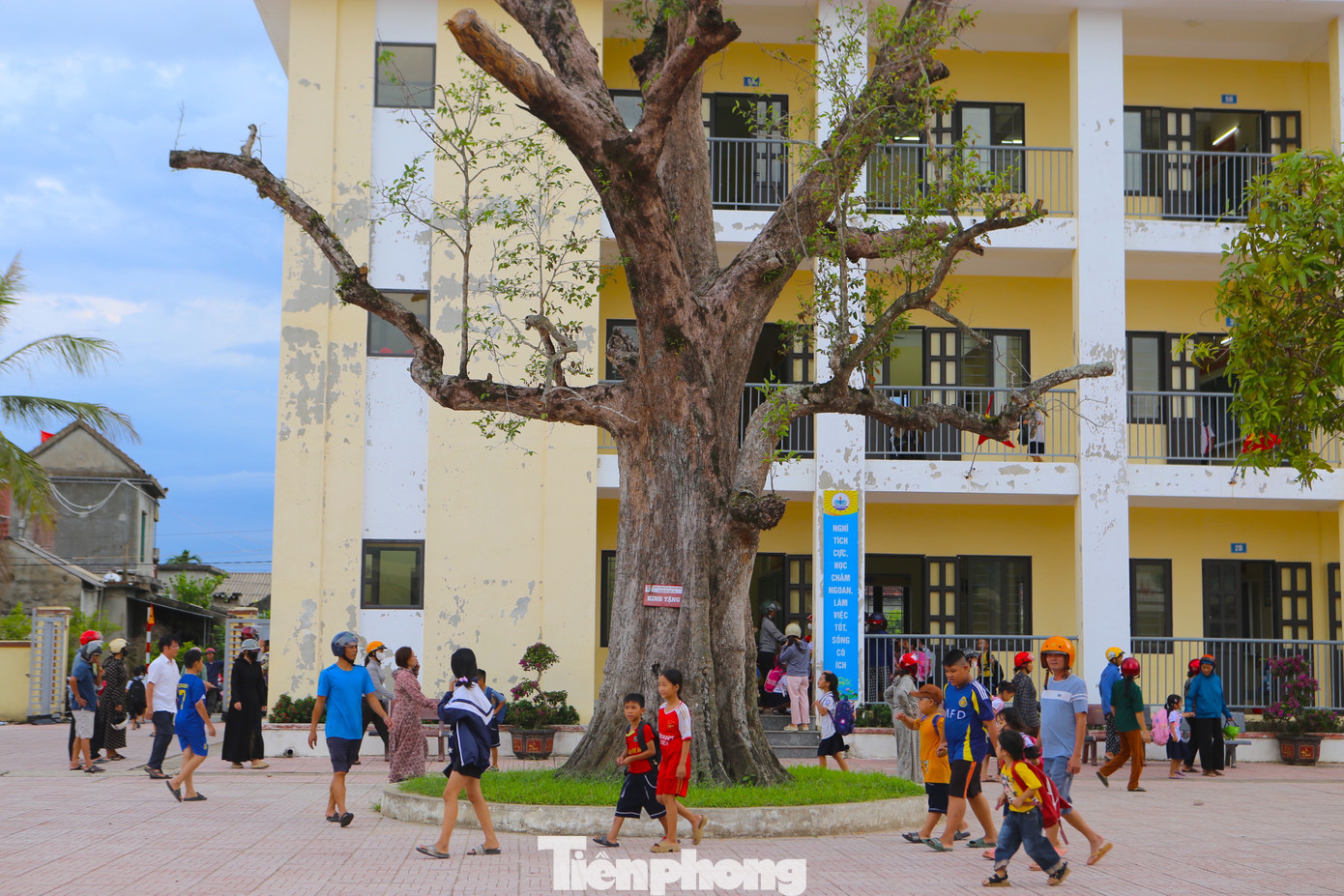 Thân cây xù xì, sần sùi theo dấu vết thời gian, từng đường nứt gãy như khắc lại tuổi đời hàng trăm năm. Tán lá vẫn xanh mướt, sum suê và vươn rộng, nhờ được người dân và nhà trường chăm sóc gìn giữ.