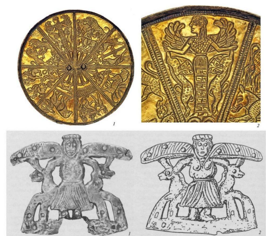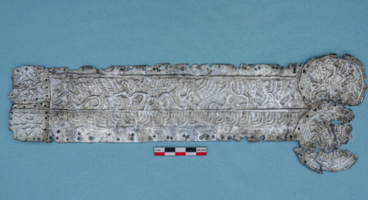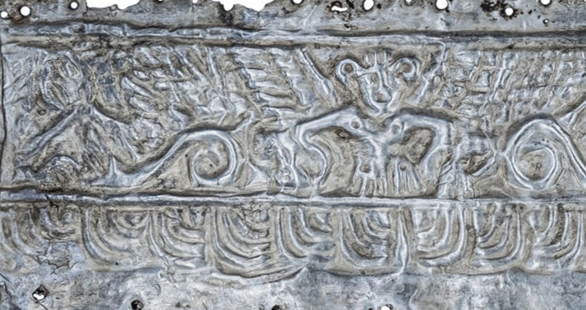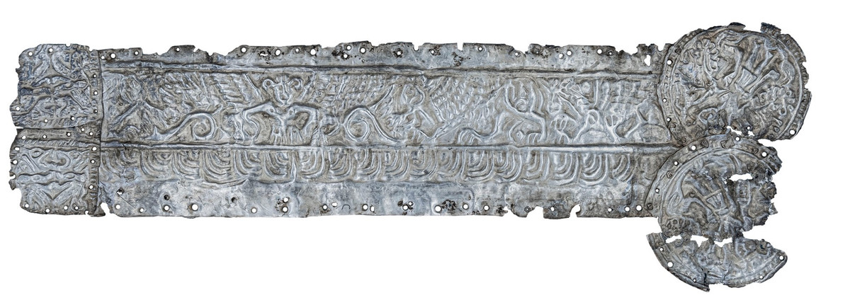 Trên tấm bia bạc này có khắc họa các vị thần Đền Scythia có cánh, và những vị thần này còn được bao quanh bởi các con kỳ lân quái vật. Ảnh: @Viện Hàn lâm Khoa học Nga.