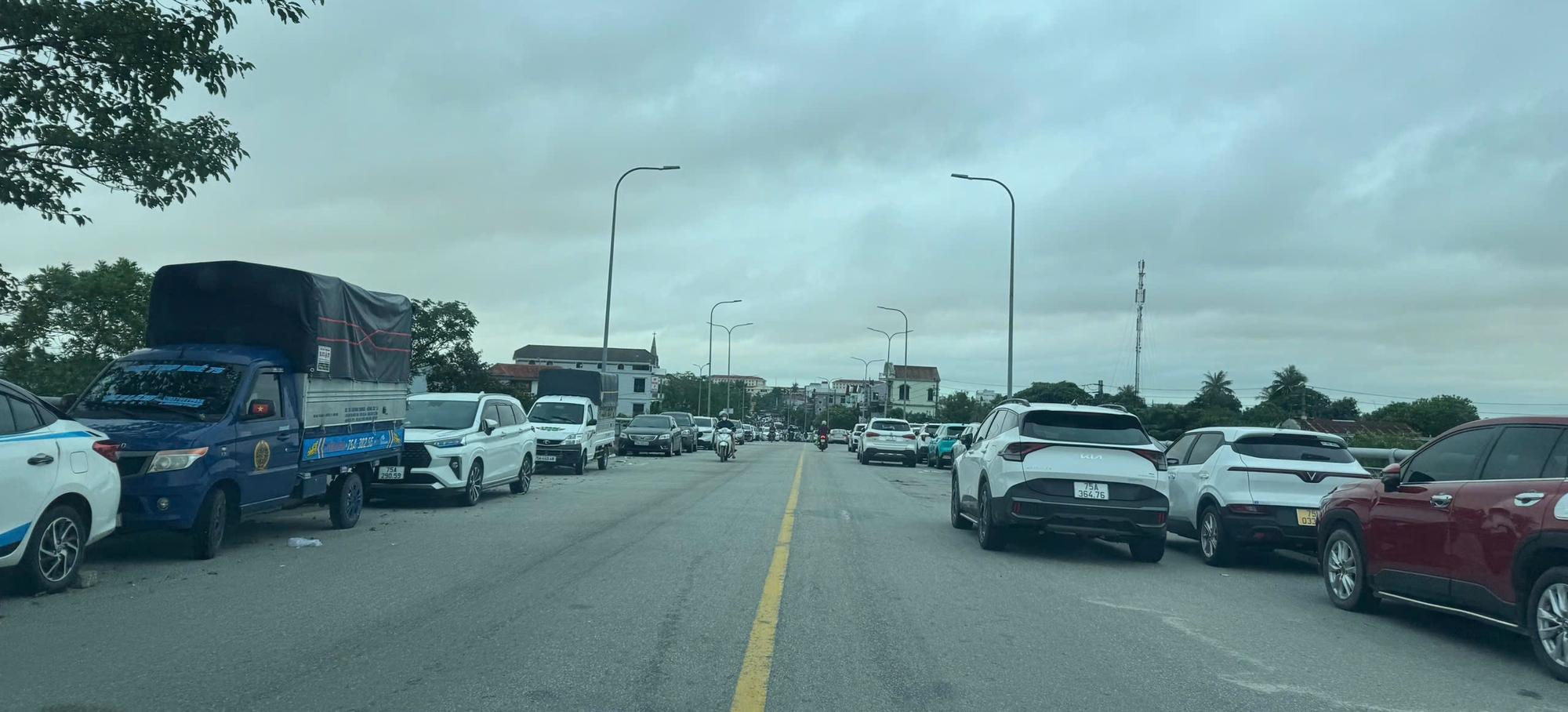 Dù nước đã xuống, trên cầu Chợ Dinh, hàng trăm ô tô vẫn đậu kín hai bên đường. Nhiều xe đỗ tràn hàng 2, hàng 3 khiến việc lưu thông của người dân gặp nhiều khó khăn.