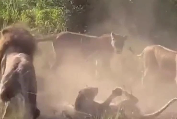 Theo đoạn clip, con báo đực bị bầy sư tử phát hiện khi đang lén lút săn mồi trong khu vực vốn thuộc quyền kiểm soát của chúng. Không chần chừ, 3 con sư tử cái lập tức lao tới bao vây, tạo thế trận khống chế để con sư tử đực tung đòn quyết định.