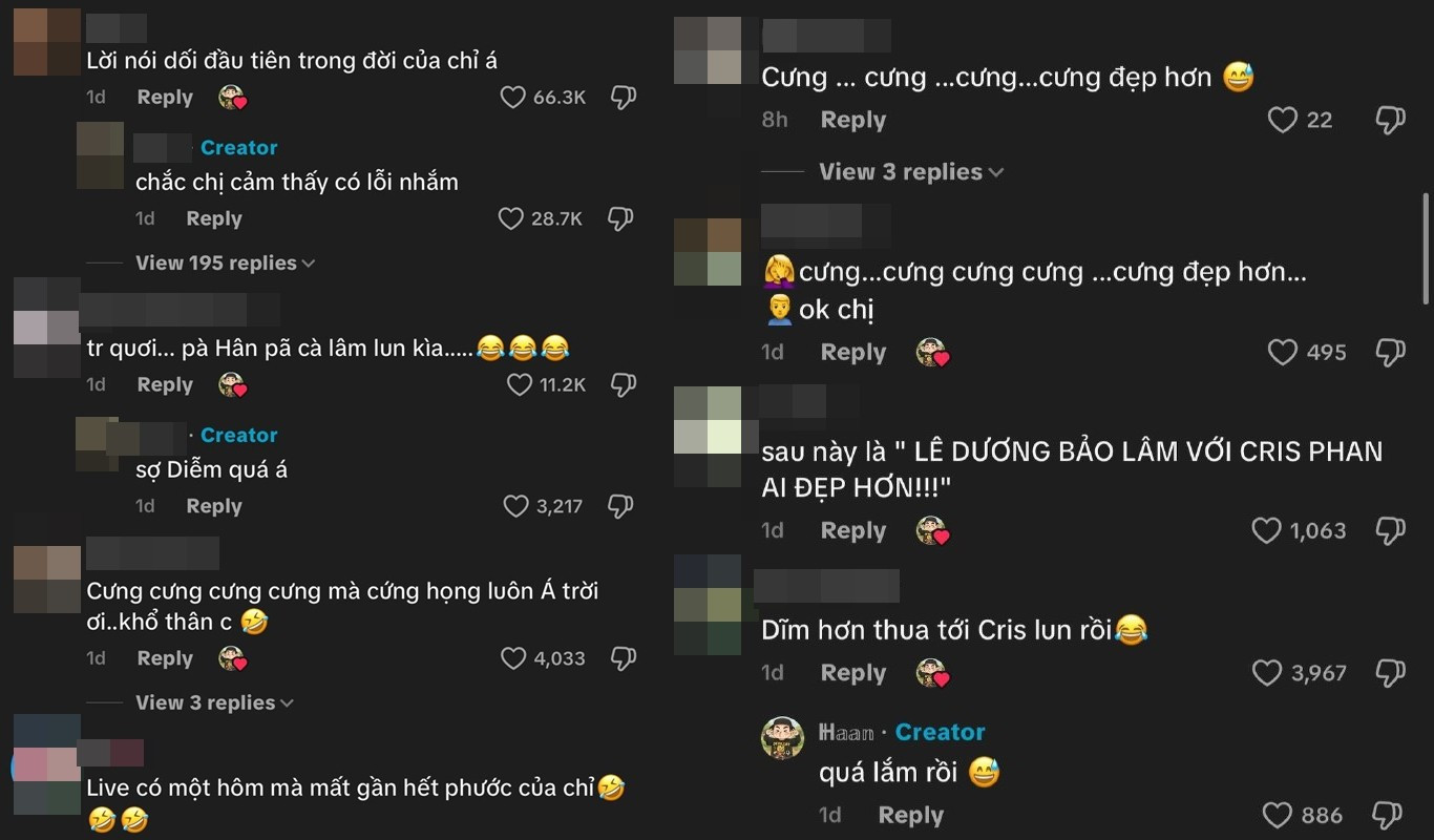Trong một video trích đoạn đang được chia sẻ rầm rộ trên TikTok, Lê Dương Bảo Lâm và Hân Nguyễn đã chào đón sự góp mặt đặc biệt của Cris Phan, khiến khán phòng livestream thêm phần náo nhiệt. Sau đó, Lê Dương Bảo Lâm đã hỏi Hân Nguyễn rằng giữa anh và Cris Phan, ai đẹp trai hơn.