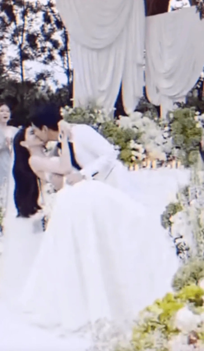 Cô dâu chú rể tình tứ trao nhau nụ hôn trong đám cưới. (Ảnh Thairath)