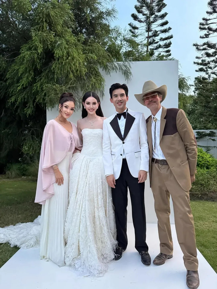 Theo nguồn tin, cô dâu Mai Davika xuất hiện trong chiếc váy cưới trắng thanh lịch, kiểu dáng tối giản nhưng tinh tế. Chú rể chọn bộ tuxedo trắng điểm xuyết nơ đen, mang phong cách cổ điển. Cả hai giữ kín thời gian và địa điểm tổ chức cho đến tận phút chót, khiến khán giả bất ngờ khi thông tin được hé lộ.