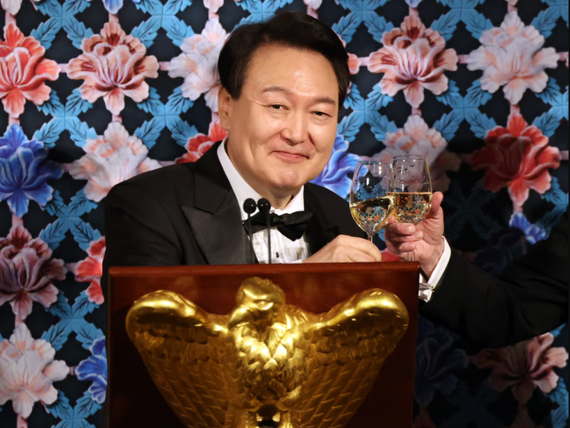 Cựu Tổng thống Hàn Quốc Yoon Suk-yeol thưởng thức ly rượu vang trong bữa tiệc tối cấp nhà nước tại Nhà Trắng năm 2023. Ảnh: Yonhap.