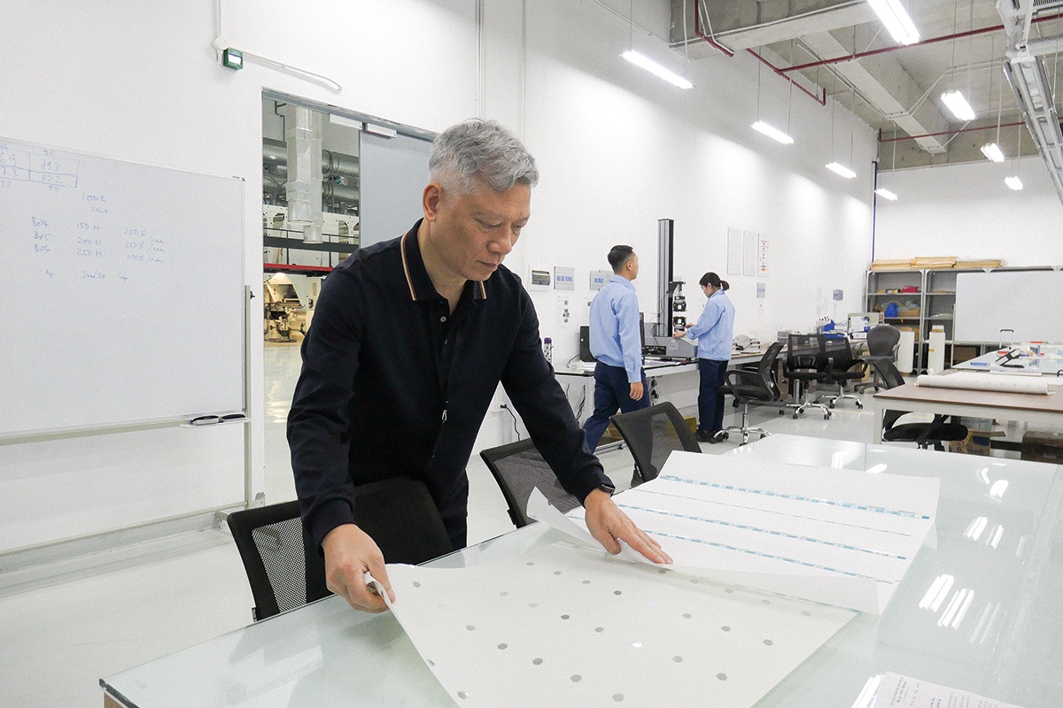 Tôi có hỏi ông Lương Ngọc Anh, làm thế nào đạt được sự “tinh khiết” đến mức lý tưởng này. Ông bảo, chỉ cần có vài hạt bụi rơi vào tấm polymer đang in thì sẽ phải hủy tất cả và làm lại từ đầu, sẽ tốn kém kinh khủng. Chính vì thế, không khí trong nhà máy này phải qua nhiều lần lọc.