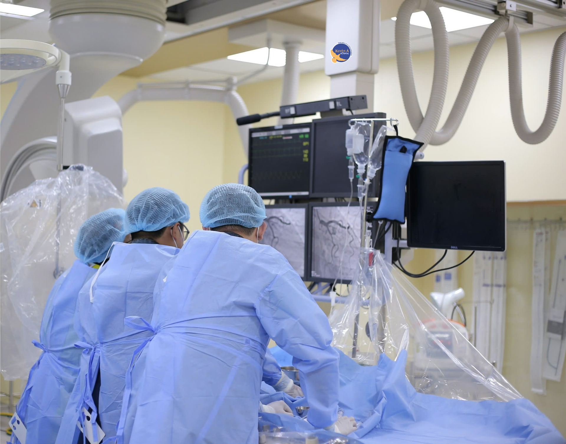 Tại Bệnh viện Đa khoa Xuyên Á (TP.HCM), bác sĩ tiến hành hồi sức, chụp mạch vành bằng hệ thống DSA ghi nhận hẹp nặng hai nhánh mạch lớn và đặt 2 stent.