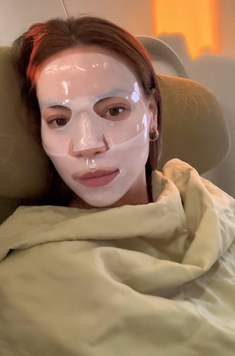 Hồ Ngọc Hà đắp mạ nạ ngay cả khi trên máy bay. Ảnh chụp màn hình