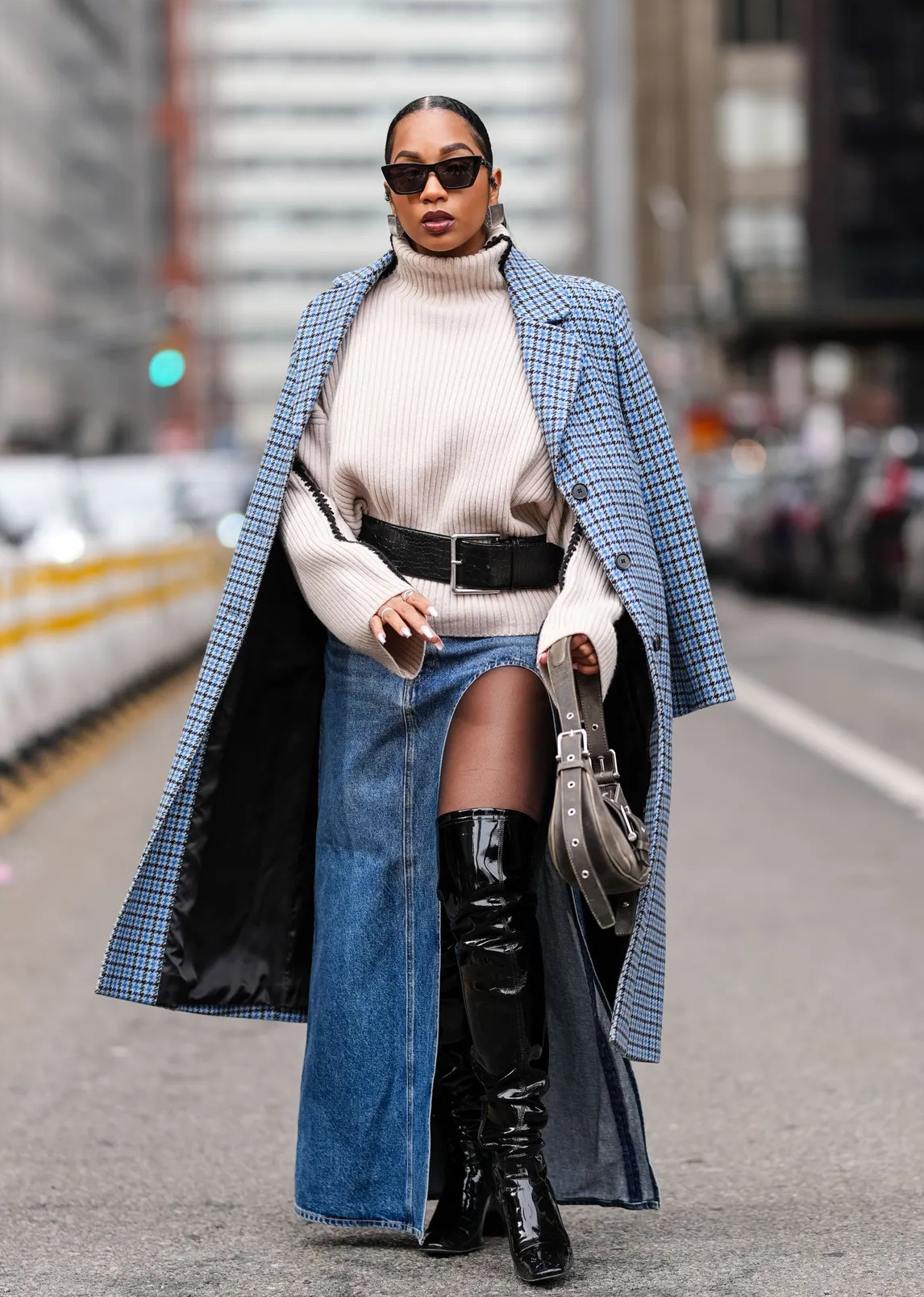 Các ngôi sao thời trang đường phố rất thường xuyên dùng mẹo này trong việc phối đồ với chất liệu denim. Ví dụ như chân váy jeans dài mặc cùng áo len rộng thùng thình, được kéo lệch một bên để hở nhiều ở phần vai, khéo léo phối cùng thắt lưng tạo nên một bộ trang phục quyến rũ nhưng nhẹ nhàng, duyên dáng.