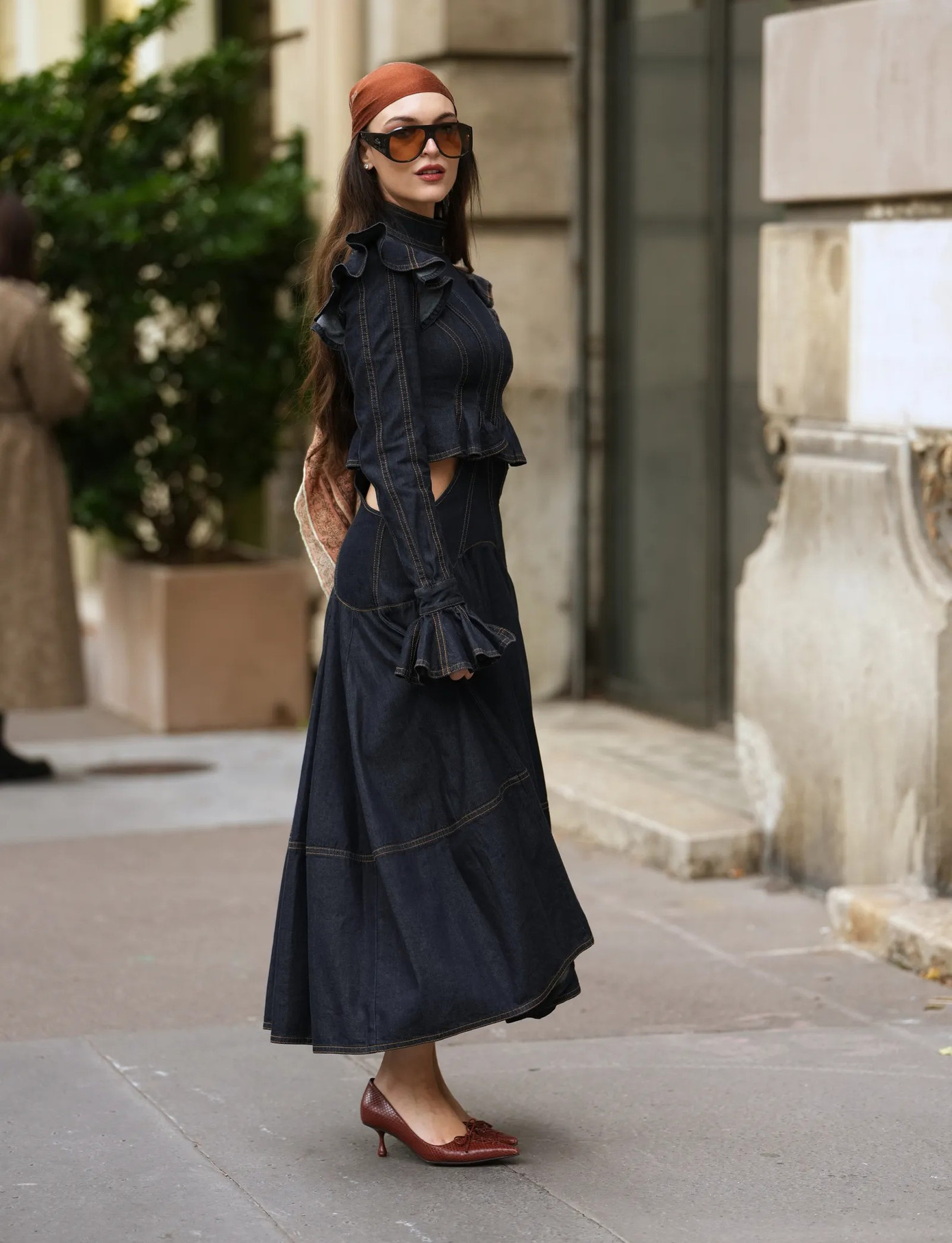 Lấy cảm hứng từ phong cách Boho, phối một bộ trang phục gồm áo sơ mi lụa thắt nơ và chân váy midi denim dài sẽ giúp bạn giữ được vẻ ngoài thanh lịch, mà đậm chất thời trang. Khi ra khỏi văn phòng, bạn có thể điểm thêm chiếc khăn trùm đầu kiểu thập niên 70 và đeo kính râm, bộ trang phục trở nên sành điệu ngay lập tức. Với những ngày bạn muốn trông phá cách hơn, hãy thay áo sơ mi lụa bằng một chiếc áo khoác jeans xanh navy đậm, cột khăn lụa quanh cổ hoặc tóc để tạo điểm nhấn nữ tính và sang trọng.
