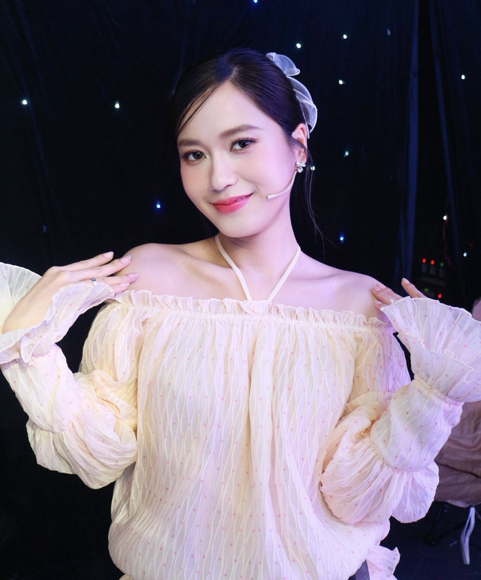 Kết quả không chỉ nằm ở con số trên bàn cân. Gương mặt Lâm Vỹ Dạ thanh thoát hơn, xương quai hàm và xương đòn nổi rõ, giúp lối trang điểm tối giản (chỉ nền mỏng, kẻ eyeliner mảnh, son nude hoặc cam đất) trở nên sắc nét và trẻ trung hơn hẳn. Ảnh: FBNV