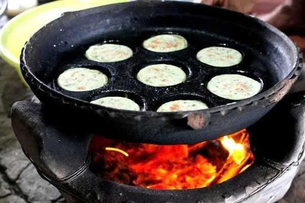 Khi chiên bánh, khuôn được làm nóng và quét dầu đều. Đổ bột vào khoảng 1/3 khuôn, khi bột chín, thêm dầu, nước cốt dừa, hành lá và phần nhân xào. Chiên lửa nhỏ đến khi bánh vàng giòn, lật mặt để chín đều. Lặp lại cho đến khi hết bột và nhân. Ảnh minh họa