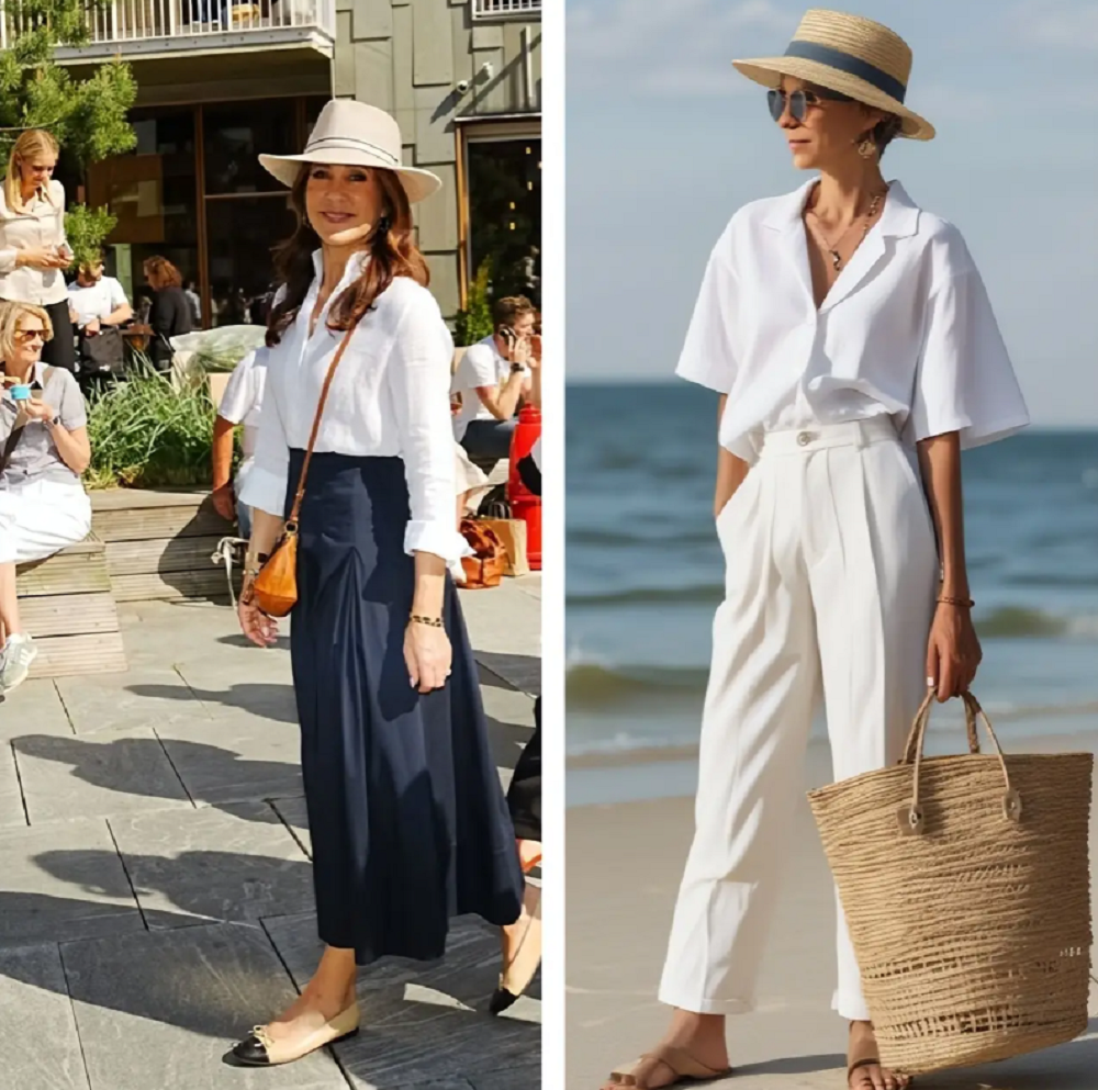 Phụ nữ ở độ tuổi U50 có thể chọn một chiếc áo sơ mi trắng bằng vải cotton mềm mại kết hợp với quần ống rộng, vừa thoải mái lại vừa thanh lịch. Sơ vin một góc áo vào quần sẽ tạo thêm nét giản dị cho trang phục.