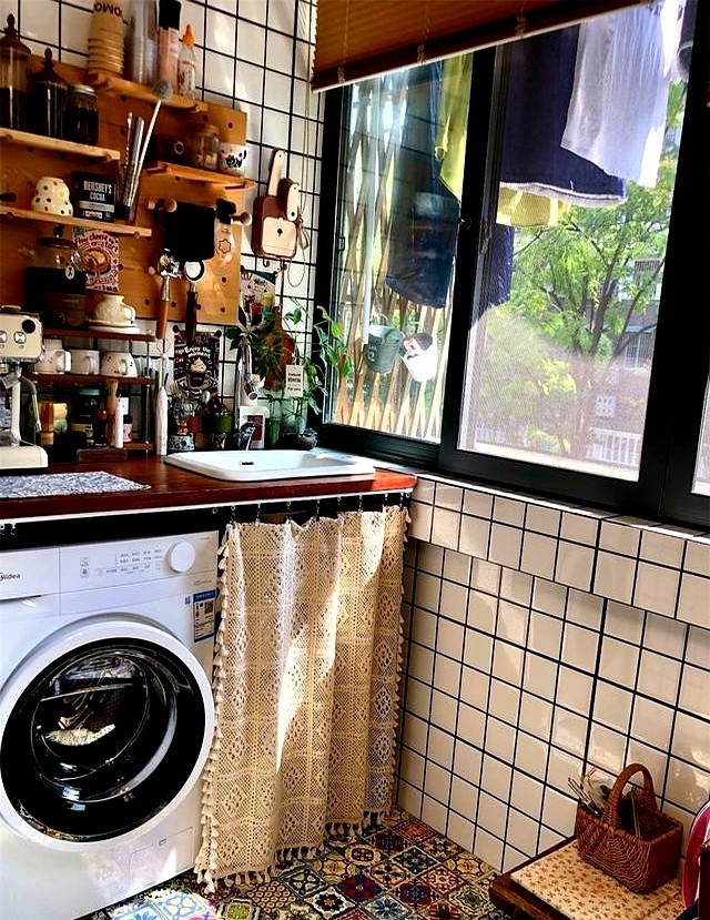 Ban công rộng 1,2m, được chia thành ba khu: góc trái sâu 30cm để máy hút bụi và đồ lau nhà; giữa là khu vệ sinh riêng cho mèo; bên phải đặt máy giặt và máy sấy chồng lên nhau, nối liền với bàn bếp. Ảnh: Sohu