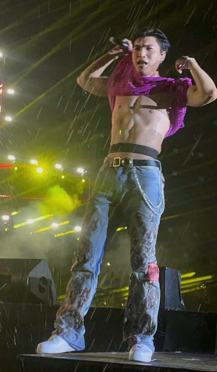Sau vài phút biểu diễn, bom nước từ sân khấu liên tục dội xuống khiến anh ướt đẫm. Khán giả bên dưới hò hét, chờ đợi màn vén áo vốn là đặc sản của Bi Rain.