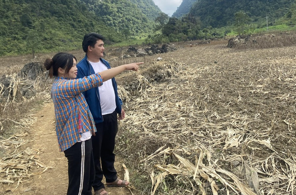 Đồng chí Nông Văn Nghiệp tìm hiểu người dân có diện tích trồng ngô bị ảnh hưởng do cơn bão số 11 (năm 2025).