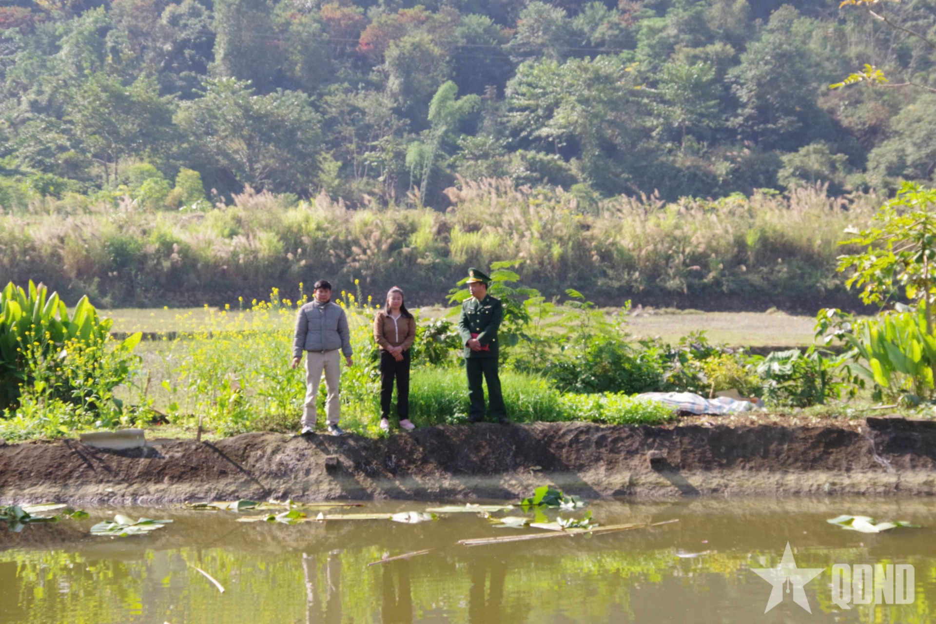 Đồng chí Lừu Văn Thân và cán bộ Biên phòng thăm mô hình nuôi cá của hộ gia đình trong bản Mắn 1.