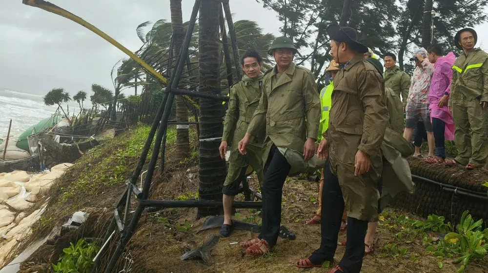 Ông Lê Ngọc Quang, Bí thư Thành ủy Đà Nẵng kiểm tra tình hình xâm thực, sạt lở tại biển Cửa Đại. Ảnh: PV