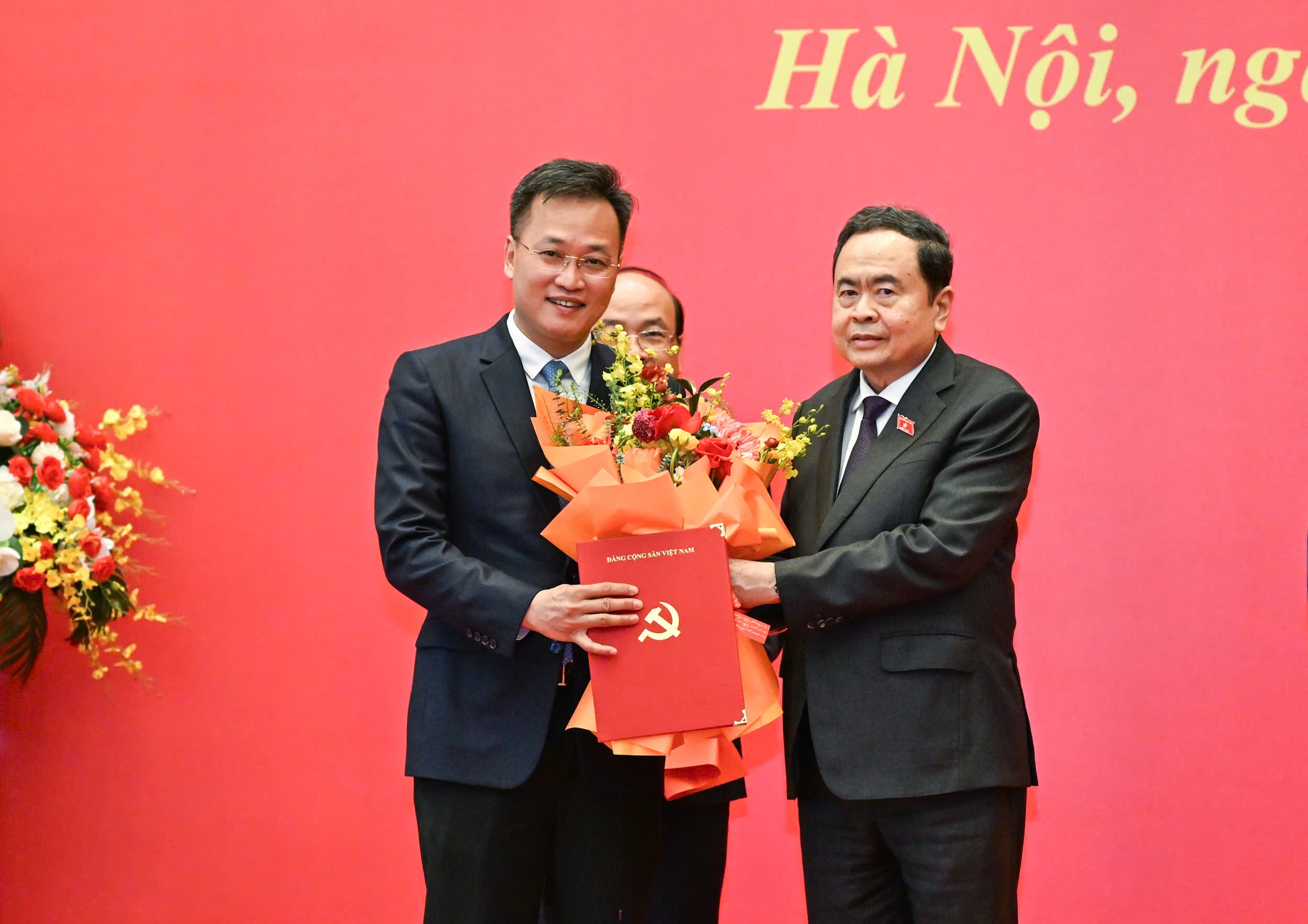 Bí thư Đảng ủy Quốc hội, Chủ tịch Quốc hội Trần Thanh Mẫn trao quyết định của Đảng ủy Quốc hội chỉ định Bí thư Đảng ủy Ủy ban Pháp luật và Tư pháp cho đồng chí Phan Chí Hiếu