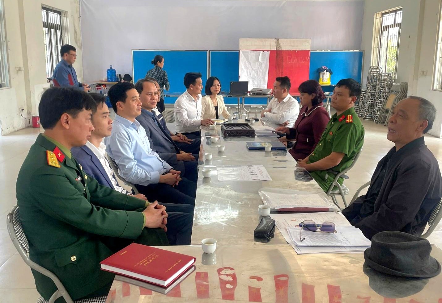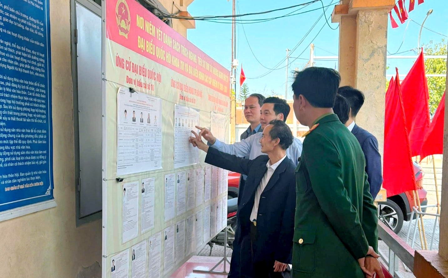 Đồng chí Nguyễn Việt Hà cùng đoàn công tác kiểm tra cơ sở vật chất phục vụ công tác bầu cử tại điểm bỏ phiếu tổ dân phố số 3. Ảnh: Hoàng Anh